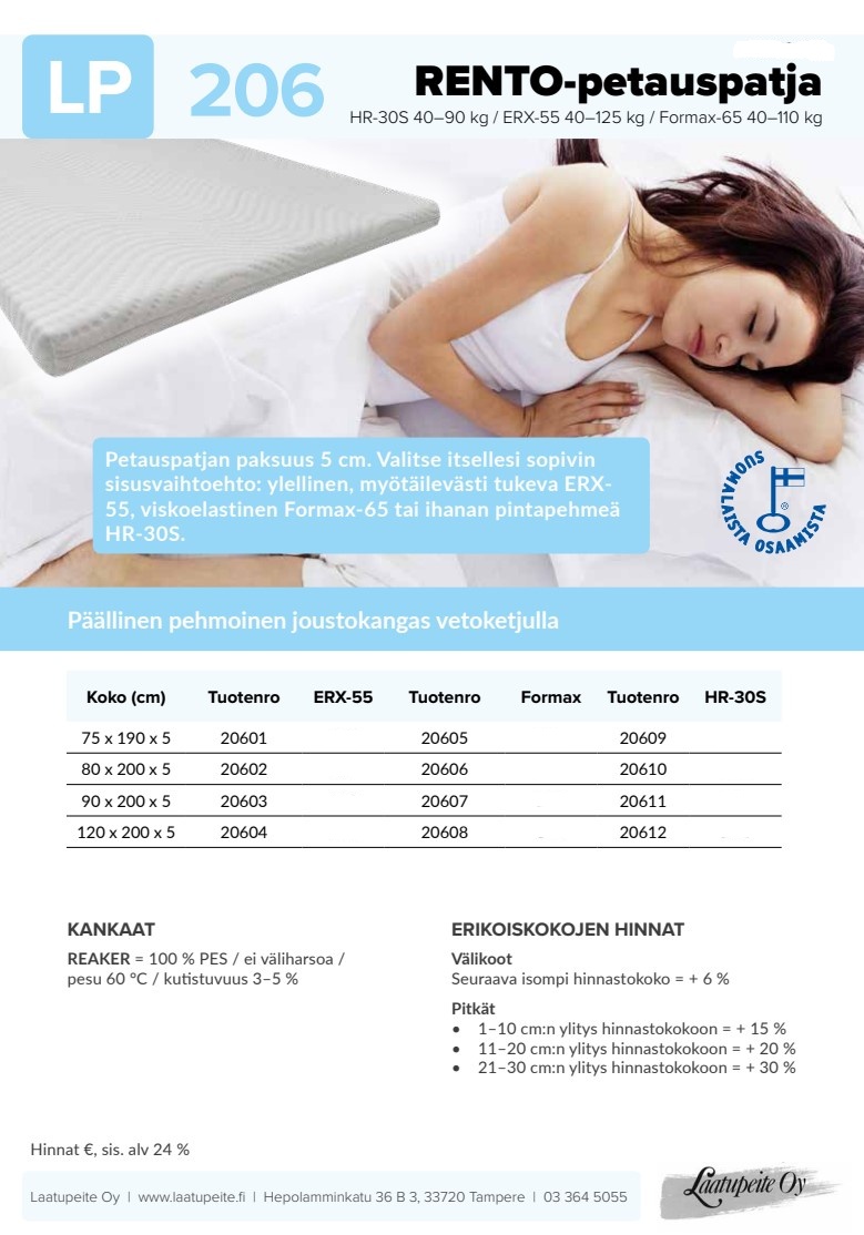 Patja on tilattavissa joko vaahtomuovisijauspatjan ja sijauspatjansuojan kanssa tai ilman – juuri sinun tarpeidesi mukaan. Lisäksi voit täydentää kokonaisuuden laadukkaalla Uniluoto- tai Pouta-tyyny- ja peittosetillä. Saatavana myös erikoismittoina tilauksesta.