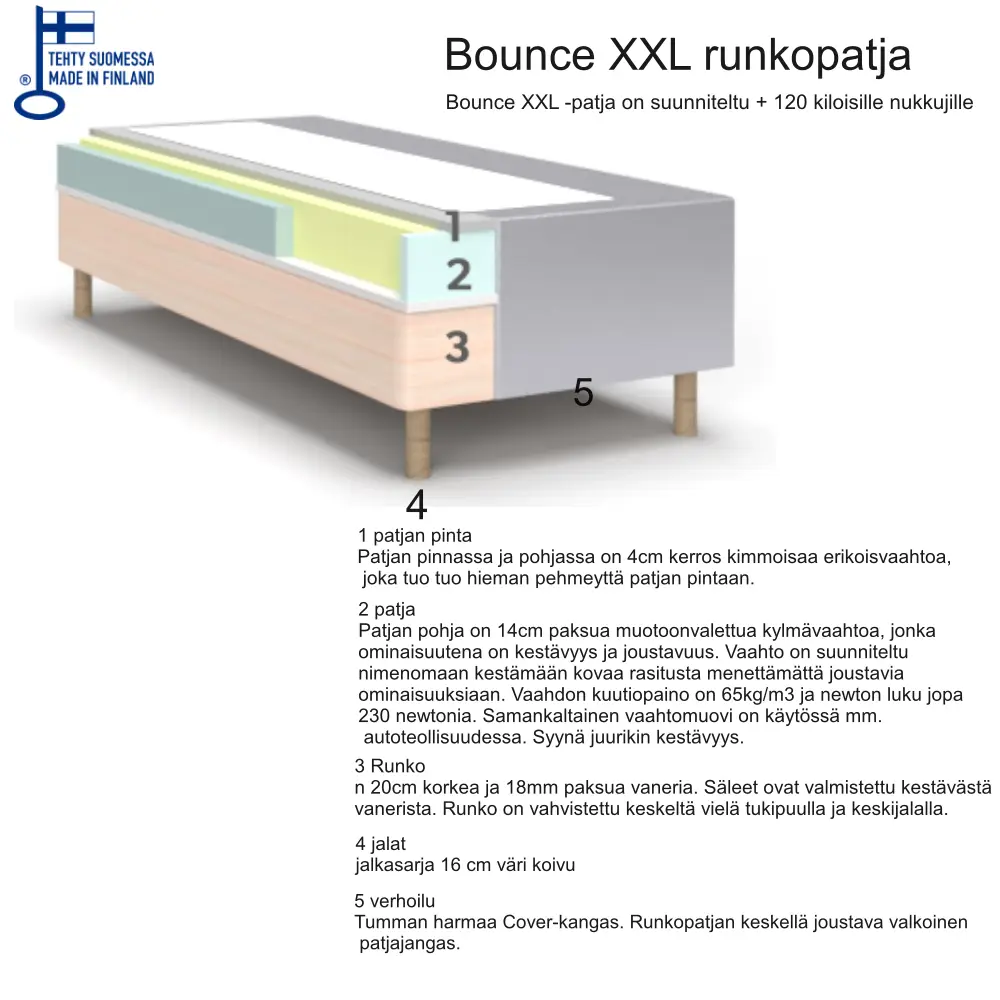 Bounce XXL -runkopatja kestää kovaa rasitusta menettämättä joustavuuttaan, ja sen kylmävaahto on samaa materiaalia, jota käytetään autoteollisuudessa sen erinomaisen kestävyyden vuoksi. Paksu ultraäänitikatulla kankaalla verhoiltu päällinen ja harmaalla Cover-kankaalla viimeistellyt sivut takaavat ylellisen ja pitkäikäisen lopputuloksen. Patja on saatavilla myös erikoismittoina, ja sen voi täydentää vaahtomuovisijauspatjalla sekä suojaavalla sijauspatjansuojalla.