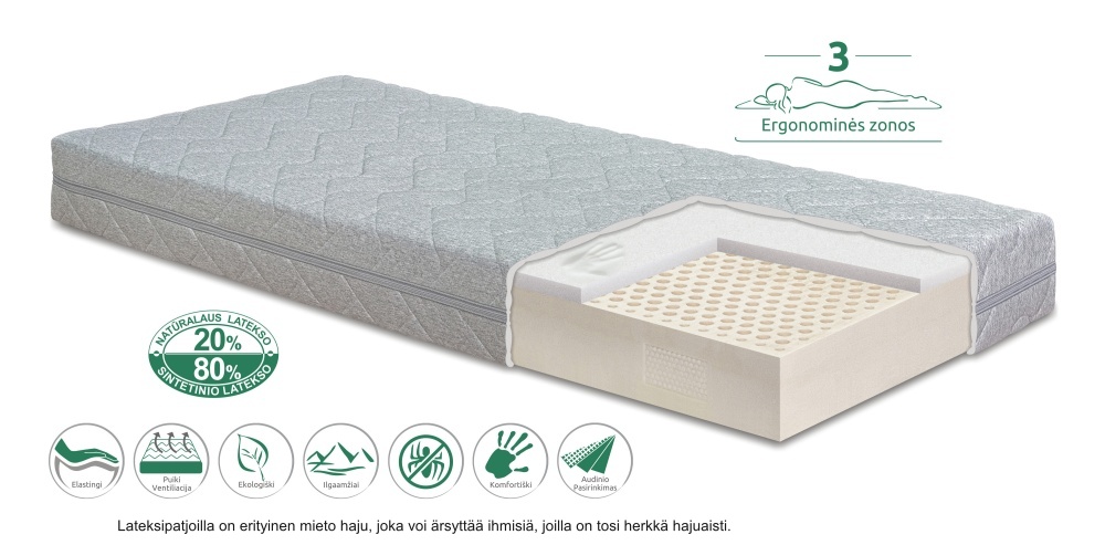 pehmeämmät vyöhykkeet päissä ja tukevampi keskiosa. Tämä rakenne jakaa painon tasaisesti, estää puutumista ja vähentää pintapaineita. Nukkumisasentoa ei tarvitse vaihtaa jatkuvasti.Lateksin ansiosta patja on täysin äänetön ja sopii kaikille – erityisesti selkä- ja hartiakivuista kärsiville sekä painaville nukkujille. Patja sopii hyvin myös painavalle nukkujalle. Patjan luonnollinen vastustuskyky pölypunkeille ja mikro-organismeille tekee siitä terveellisen valinnan.