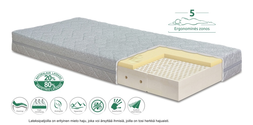 Erittäin hengittävä ergonominen 5 vyöhykkeen lateksipatja viscoelastisella Eucaterm C Soya täytteellä joka parantaa luonnonkumin ominaisuuksia. Uuden sukupolven Eucatherm C Soya on täyttää erittäin korkeat vaatimukset sopii koostumuksen ansiosta hyvin allergikoilla ja se palautuu täydellisesti alkuperäiseen muotoonsa käytön jälkeen. Lateksipatjan patjan toinen puoli on viskoelastinen joka antaa patjalle kovemman puolen nukkua ja samalla muotoutuu nukkuessasi kehon lämmön avulla ja antaa täydellisen mukavuuden nukkuessasi. Näin voit valita itse kumman puolen valitset. Itse Latex eli luonnonkumi patja on elastinen, kimmoisa, hygieeninen, antibakteerinen patja joka tukee täydellisesti nukkujan vartaloa. Patjat eivät sisällä jousia vaan patja on valmistettu luonnonkumista, joka reikien avulla pitää patjan hyvin ilmastoituna ja hygieenisena sillä patjan suojapussit voidaan irrottaa ja pestä. Patjat on sertifioitu ja täyttää tiukat laatuvaatimukset. Rakenteensa ansiosta patjassa on hyvä ilmanvaihto ja luonnollinen vastustuskyky pölypunkeille ja muille mikro-organismeille.