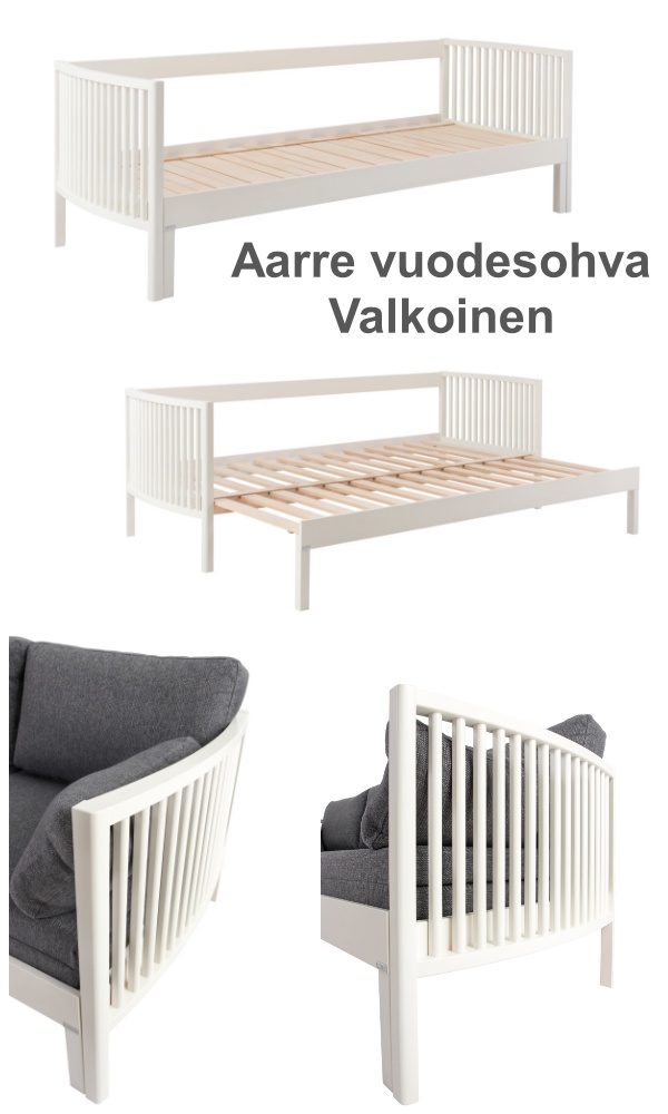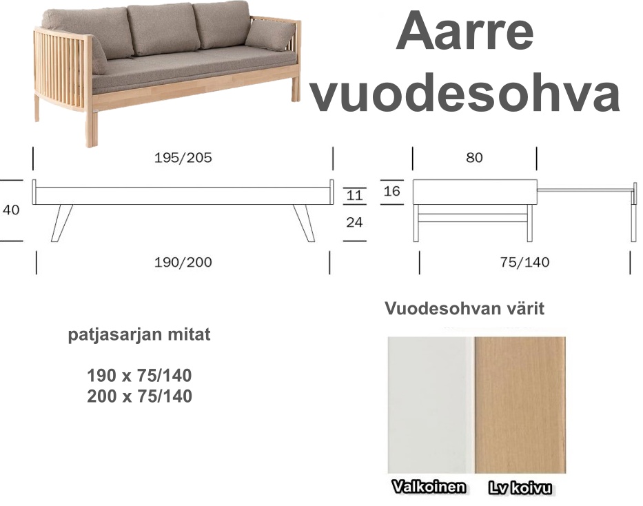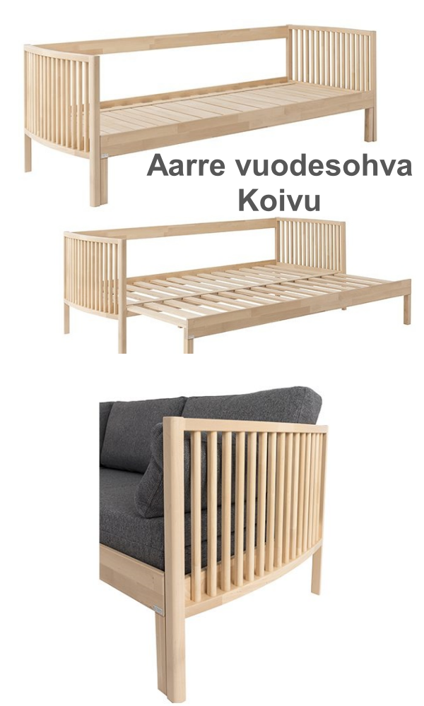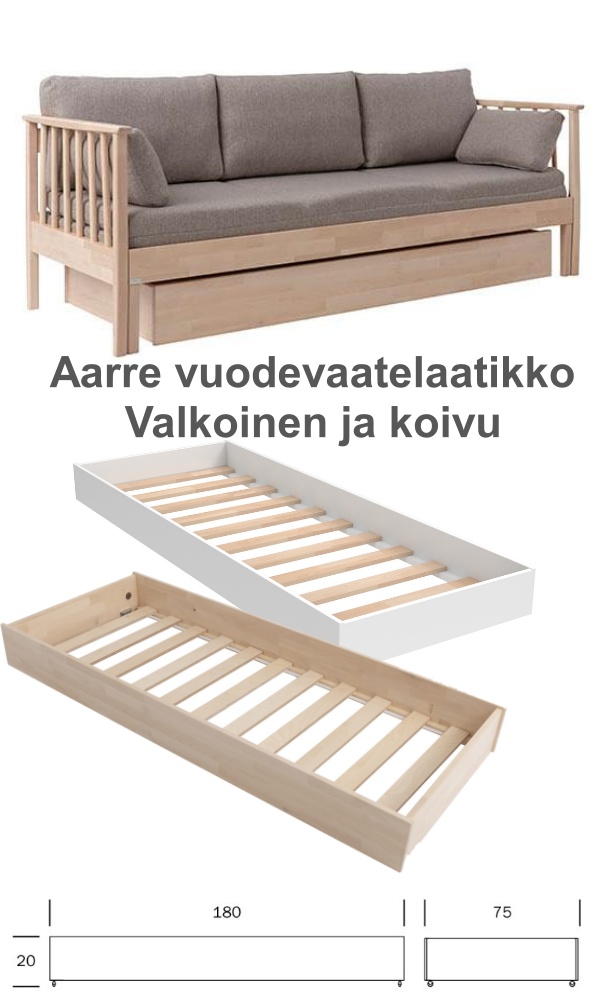 kahdessa eri värissä kuten koivu ja valkoinen. Lisäksi voit täydentää kokonaisuutta vuodesohvaan sopivalla vuodevaatelaatikkolla. Aarre-vuodesohva on erinomainen valinta sinulle, joka arvostat laadukasta käsityötä, kestävyyttä ja tyylikkyyttä. Tilaa oma Aarre-vuodesohva jo tänään!