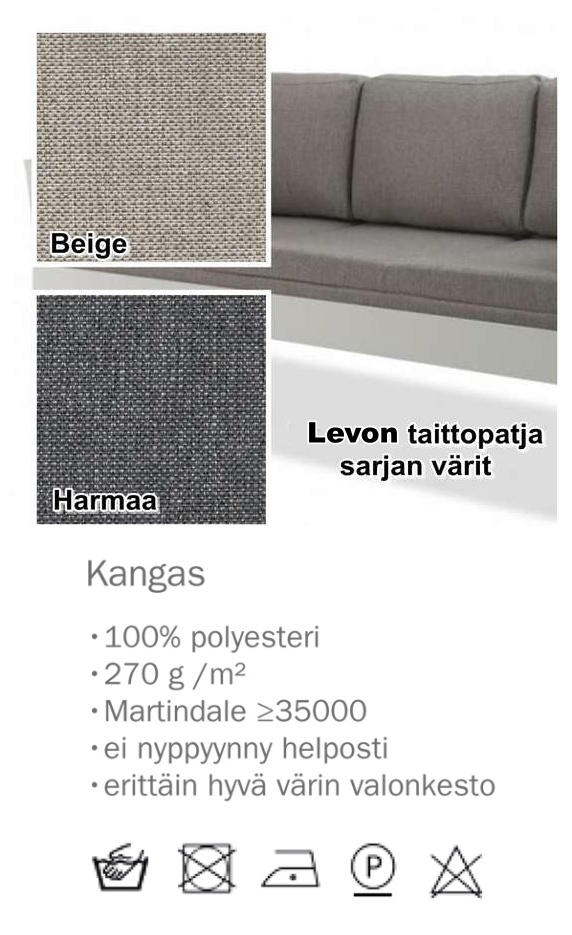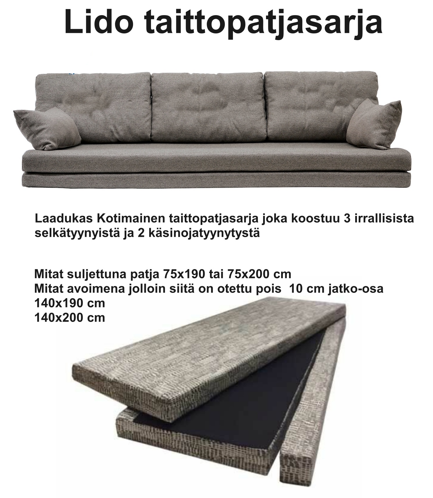ja voit valita koon 2 eri vaihtoehdosta. Vuodesohvaan on valittavana 2 eri taittopatjasarja vaihtoehtoa, jossa on kolme isoa pehmeää selkänojatyynyä sekä kaksi pienempää käsinojatyynyä. Toinen malli on Lido taittopatjasarja, jossa värejä on enemmän, mutta se valmistetaan tilauksesta, kun taas Levon taittopatjasarja on varastotuote. Patjan saa aukaistua ja levitettyä vuodepatjaksi. Vaahtomuovinen patja on verhoiltu kulutusta kestävällä kankaalla, joka takaa pitkäikäisyyden.