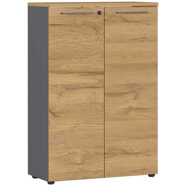 Värivaihtoehdot tammi/grafiitti ja vaaleanharmaa tuovat työtilaan raikkaan ja elegantin ilmeen. Selkeälinjainen design sulautuu moniin sisustustyyleihin ja tekee kaapista sekä näyttävän että käytännöllisen osan kokonaisuutta.