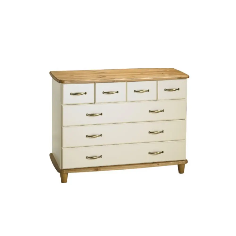 Voit räätälöidä lipaston ilmeen omaan sisustukseesi sopivaksi valitsemalla rungon väriksi valkoisen tai vaniljan ja yhdistämällä sen antiikin, pähkinän tai harmaan sävyisiin kanteen ja jalkoihin. Tyylin viimeistelevät vetimet ovat saatavilla kahdessa sävyssä – elegantissa antiikkimessingissä tai modernissa mattakromissa – antaen lipastolle viimeistellyn ja yhtenäisen ilmeen.