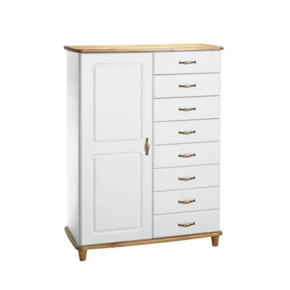 Lipastokaapissa on yksi kaappi ja kahdeksan metallikiskoilla varustettua laatikkoa, jotka tarjoavat runsaasti tilaa kodin tavaroille. Käytännöllinen rakenne pitää kaiken järjestyksessä ja tekee arjesta sujuvampaa. Valittavissa on useita väriyhdistelmiä rungon, kannen ja vetimien osalta – vaihtoehtoina muun muassa antiikkimessinki ja mattakromi, joiden avulla voit viimeistellä kokonaisuuden oman sisustustyylisi mukaiseksi.