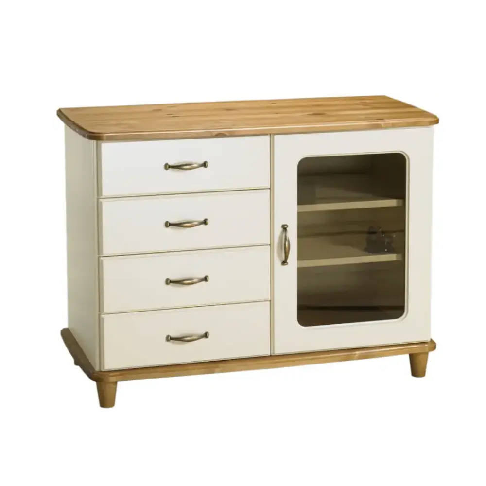 Aino Taso 95104 yhdistää lasiovellisen kaapin ja neljä vetolaatikkoa harmoniseksi kokonaisuudeksi, joka tarjoaa sekä käytännöllisyyttä että tyylikkyyttä. Sen selkeä muotoilu ja toimiva rakenne tekevät siitä täydellisen lisän olohuoneeseen, ruokailutilaan tai työhuoneeseen – sinne, missä tarvitaan säilytystilaa ilman kompromisseja ulkonäön suhteen.