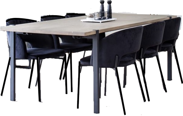 Upea moderni Aki ruokailuryhmä Gap-tuoleilla yhdistää ajattoman harmaapetsatun tammipöydän ja rohkean tyylikkäät Gap-tuolit harmoniseksi kokonaisuudeksi. Mustat metallijalat tuovat ryhmään ryhdikästä ilmettä, joka sopii erinomaisesti moderniin, skandinaaviseen tai teollishenkiseen sisustukseen.