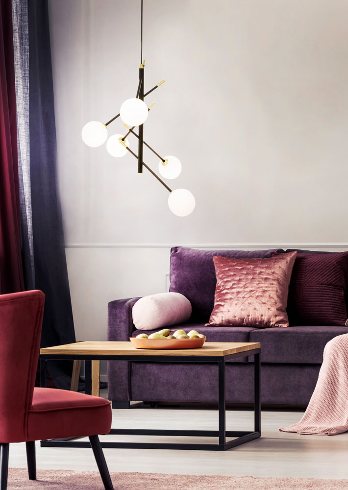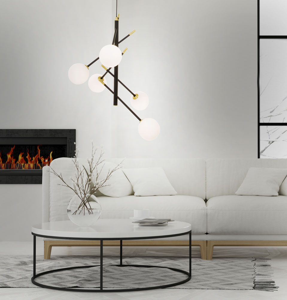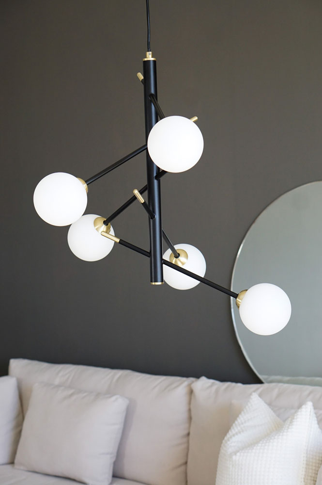 Viisi pallomaista lasikupua levittävät valon miellyttävästi joka suuntaan, luoden häikäisemättömän ja kutsuvan tunnelman. Akrobat-riippuvalaisin toimii erinomaisena yleisvalona ja korostaa tilan mittasuhteita samalla, kun se lisää sisustukseen tyylikästä rytmiä.