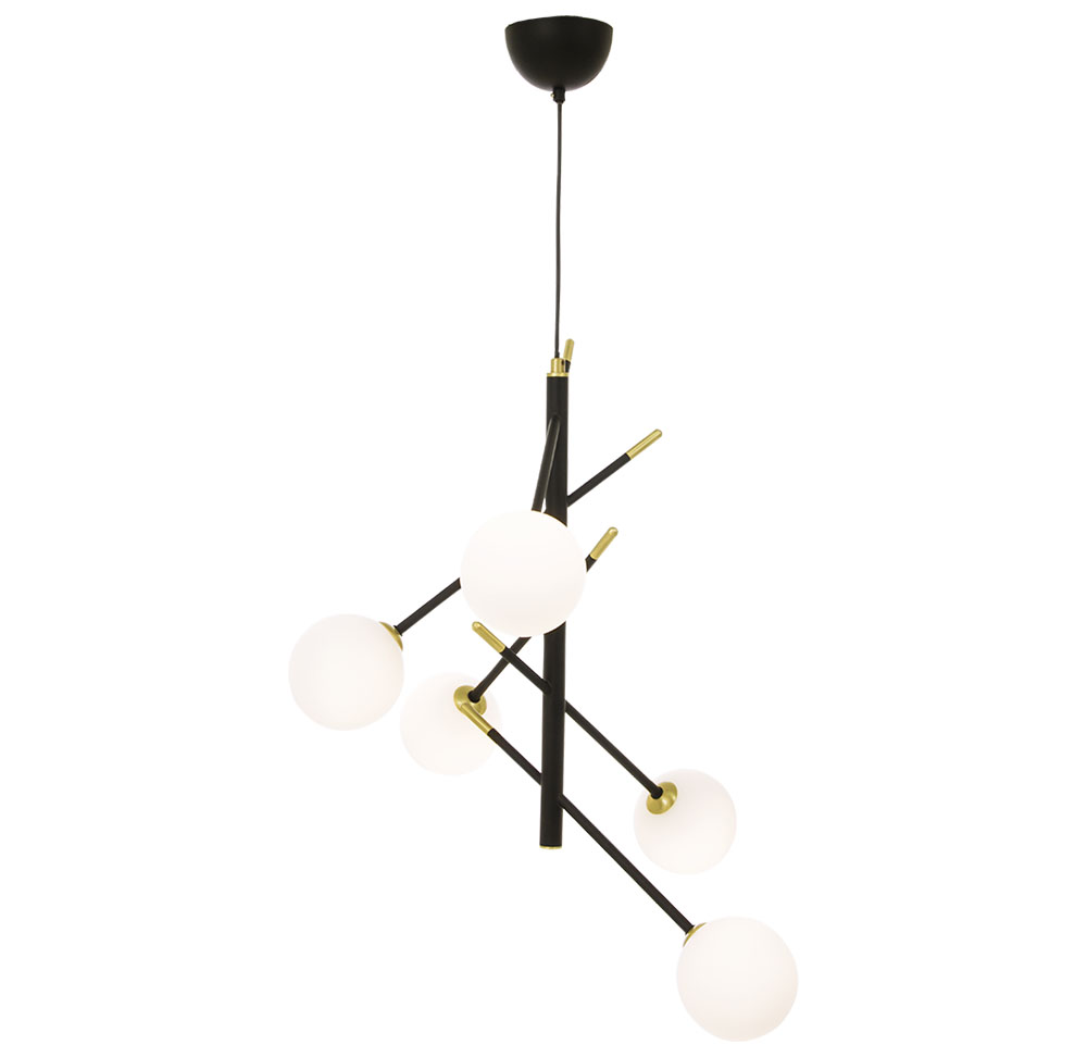 Moderni ja näyttävä viisihaarainen Akrobat riippuvalaisin on katseenvangitsija, joka tuo tilaan arkkitehtonista ilmettä ja ajattoman modernia muotoilua. Metallirunko on saatavilla mustana tai eleganttina mattamessinkinä, ja opaaleista lasikuvuista muodostuva kokonaisuus sopii täydellisesti ruokailutilaan, olohuoneeseen tai avaraan aulatilaan.