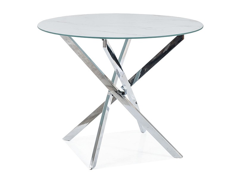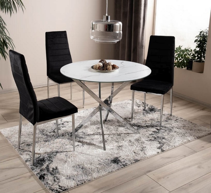 Alba pyöreä ruokapöytä yhdistää karkaistun lasikannen harmaalla marmorikuvioinnilla ja kromiset metallijalat, luoden näyttävän ja modernin keskipisteen ruokailutilaasi. Sen huolella viimeistelty design tuo tilaan ylellisyyttä ilman, että kokonaisuus tuntuu raskaalta.
