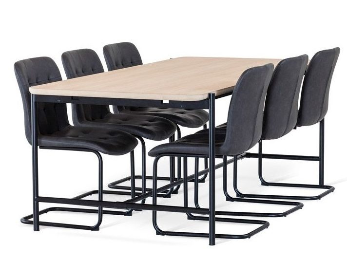 Ryhmään sisältyy 6 kappaletta Frank-tuoleja, joissa metallijalat ja helppohoitoinen keinonahkaverhoilu yhdistävät modernin ulkonäön ja käytännöllisyyden. Tuolit ovat saatavilla mustana tai harmaana, joten kokonaisuuden ilme on helppo sovittaa omaan sisustukseen. Miellyttävä istuinkorkeus ja ergonominen muotoilu takaavat hyvän istuinmukavuuden.