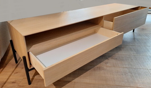 TV-tasossa on vasemmalla avohylly ja laatikko sekä oikealla kaksi tilavaa laatikkoa, jotka tarjoavat runsaasti säilytystilaa elektroniikalle, kaukosäätimille ja muille olohuoneen tarvikkeille. Push to open -mekanismi kaikissa laatikoissa viimeistelee minimalistisen ulkonäön ja tekee käytöstä vaivatonta ilman näkyviä vetimiä.