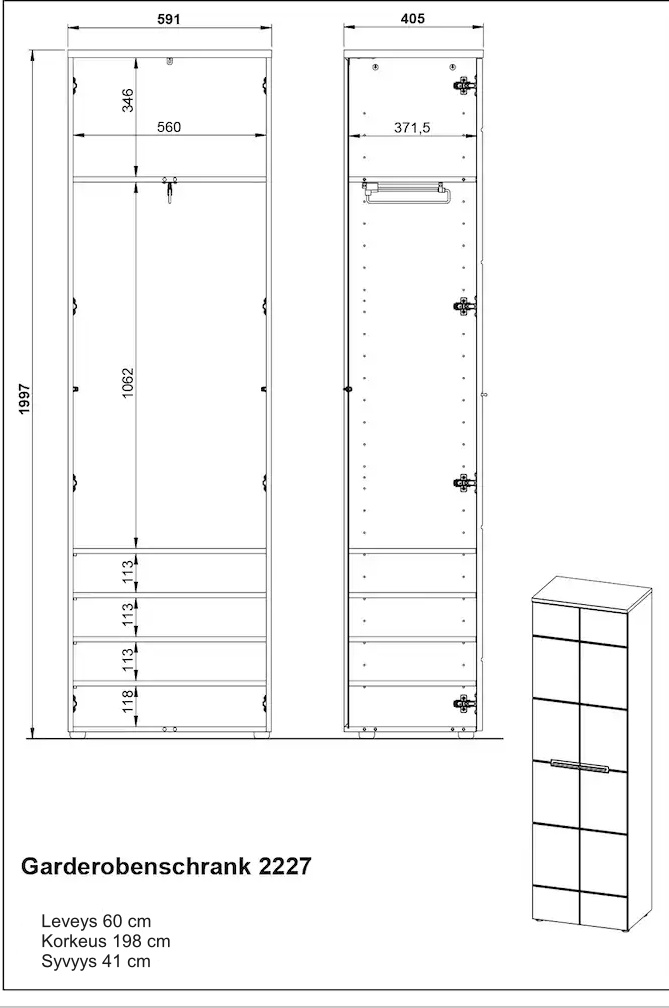 | 60 cm | 41 cm | 198 cm | cm | cm | cm | cm | cm | cm | cm | cm | cm | cm | cm | cm | cm | cm | cm | cm | cm | cm | cm | cm | cm | cm | cm | cm | cm | ABS reunat, Kalustelevy, Korkeakiiltoinen, Mdf, Melamiinihartsipinoite, Ulosvedettävä vaatetanko, Vedin metallia | Tammi, Valkoinen | cm | Korkeussäädettävät hyllyt, Laatikoissa itsestään sulkeutuva mekanismi, Ovissa hidastinmekanismi | Saatavana kasattuna - kasaus tilataan kassalla, Tilaustuote | Toimitus osina | 52 kg | Saksa | cm | cm | cm |