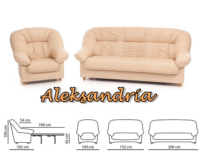 Aleksandria nojatuoli omaa retron muotoilun, joka sopii moniin eri sisustuksiin. Pienen tilan Aleksandria sohva tarjoaa sekä mukavuutta että käytännöllisyyttä. Runko on laadukasta massiivipuuta, kalustelevyä sekä vaneria. Istuintyynyt ovat kiinteät. Sohvan tausta on myös viimeistelty, joten sijoitus huoneen keskelle on myös mahdollista.