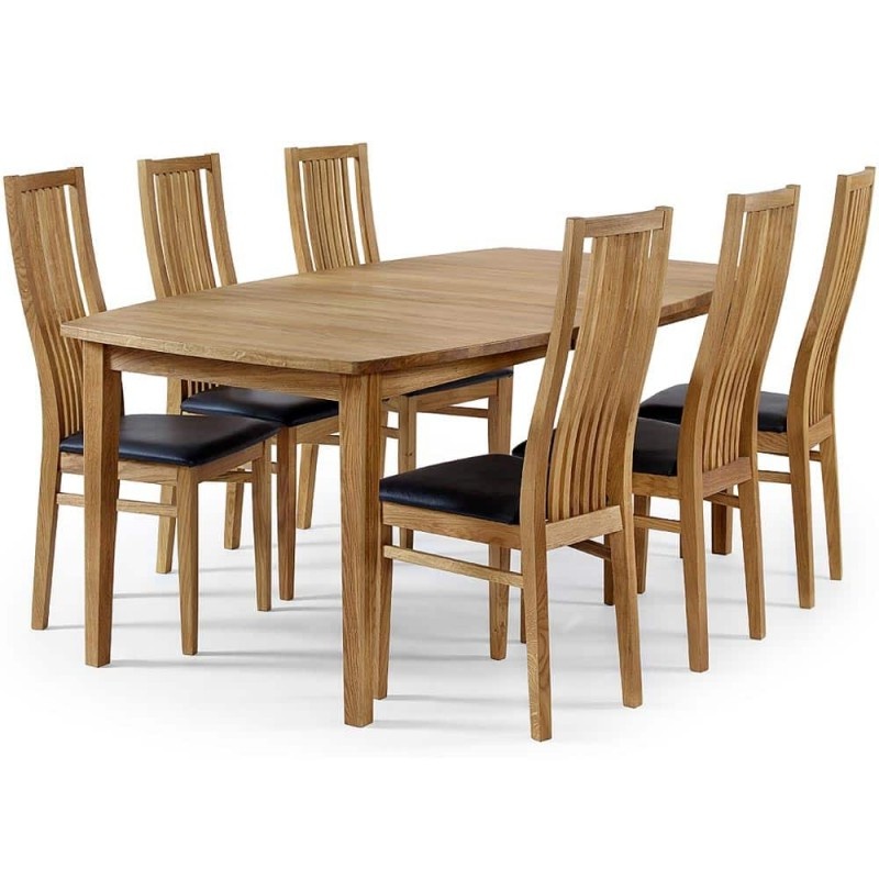 Ryhmään sisältyy 6 kappaletta Allegro-tuoleja, joissa öljytty massiivitammi yhdistyy mustaan keinonahkaverhoiluun. Keinonahka on helppohoitoinen ja miellyttävä istua, ja ergonominen mitoitus takaa hyvän istuinmukavuuden myös pidempiin ruokailuhetkiin. Ryhmä toimitetaan osissa, mikä helpottaa kuljetusta ja käyttöönottoa.
