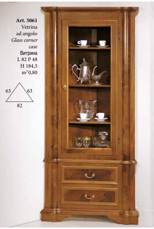 Amanda 5061 -kulmavitriini tuo kotiisi ajatonta eleganssia ja laadukasta italialaista käsityötaitoa, jonka juurikuviopinta ja viimeistelty lakkaus tekevät siitä näyttävän sisustuselementin. Sen kulmaan sijoittuva rakenne säästää tilaa ja antaa samalla huoneelle arvokkaan, viimeistellyn ilmeen.