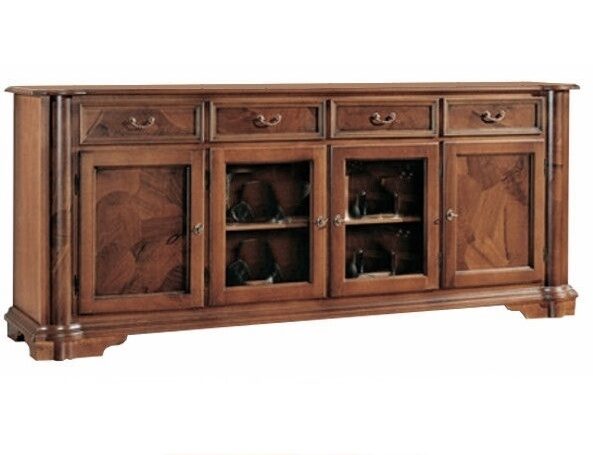 Neljä ovea – joista kaksi lasiovilla – sekä neljä vetolaatikkoa tarjoavat runsaasti säilytystilaa erilaisille esineille. Kaappien kiinteät välihyllyt lisäävät käytettävyyttä, tehden arjen järjestyksestä helppoa ja tyylikästä.