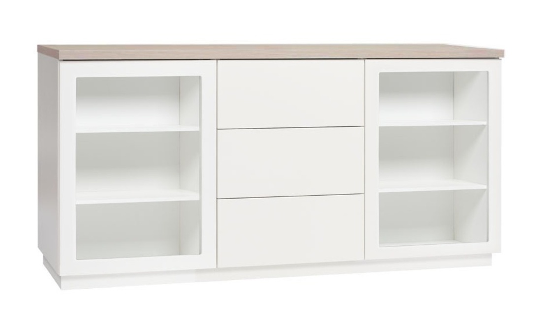 Senkissä on kolme tilavaa laatikkoa ja reunoilla kaapit, joissa kummassakin on kaksi korkeussäädettävää hyllyä. Oviin voit valita joko kirkkaat lasiovet tai maitolasiovet, ja hyllyiksi joko kirkkaat lasihyllyt tai valkoiset hyllyt – valinta on sinun. Näin muokkaat kaapin ulkonäön ja tyylin juuri omaan sisustukseesi sopivaksi. Push to open -mekanismi takaa ovien ja laatikoiden sulavan ja vetimettömän käytön, täydentäen modernia ja minimalistista ilmettä.