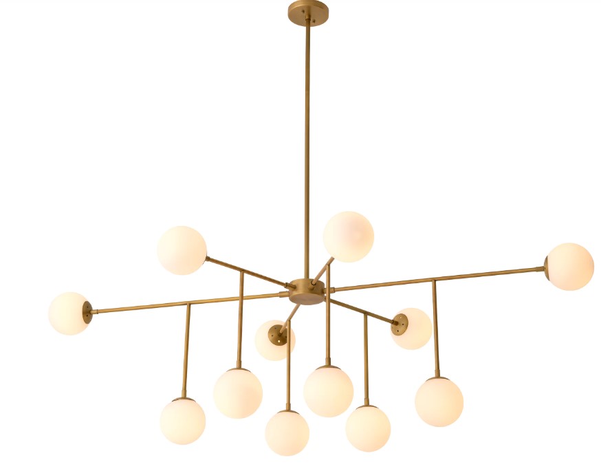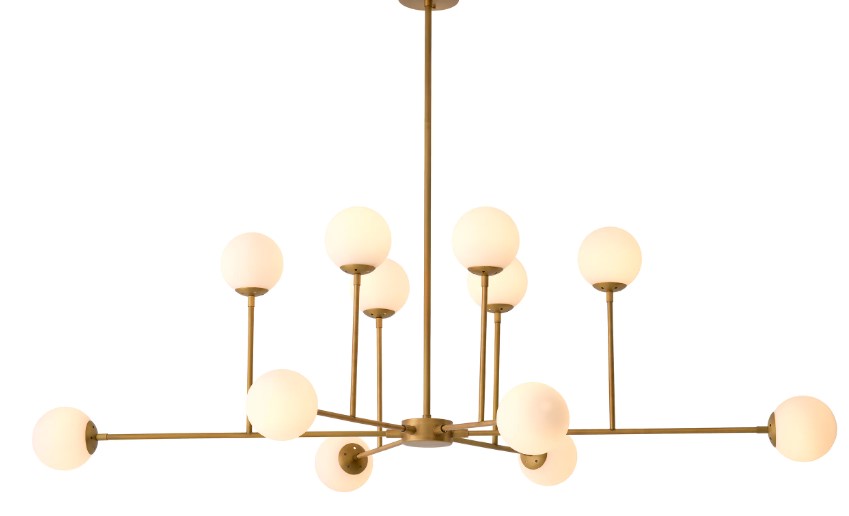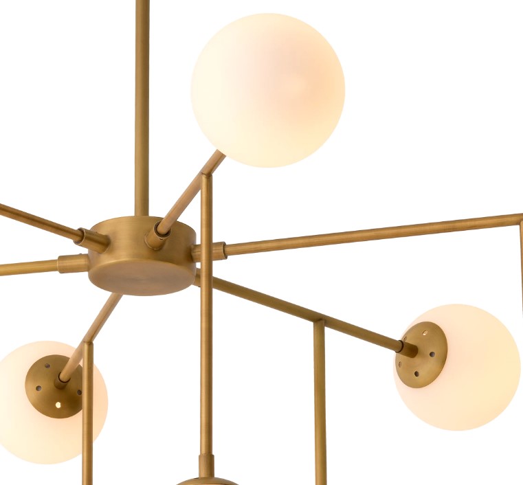 Aram kattovalaisin yhdistää messingin sävyisen rungon ja kaksitoista valkoista lasipalloa, luoden näyttävän ja elegantin kokonaisuuden, joka viimeistelee tilan modernilla ilmeellä. Valaisimen harmoninen muotoilu toimii sekä sisustuselementtinä että tehokkaana valonlähteenä.