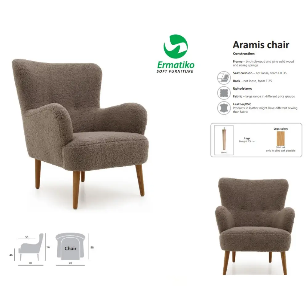 Aramis-nojatuolissa yhdistyvät laadukkaat materiaalit ja tarkkaan mietitty ergonomia. Tukeva massiivipuu- ja vanerirunko takaa kestävyyden, ja kiinteät istuin- sekä selkätyynyt säilyttävät muotonsa pitkään. Nojatuoli toimitetaan valmiiksi koottuna – vain jalat kiinnitetään paikoilleen – joten pääset heti nauttimaan sen tyylikkäästä ulkonäöstä ja napakasta istuinmukavuudesta.