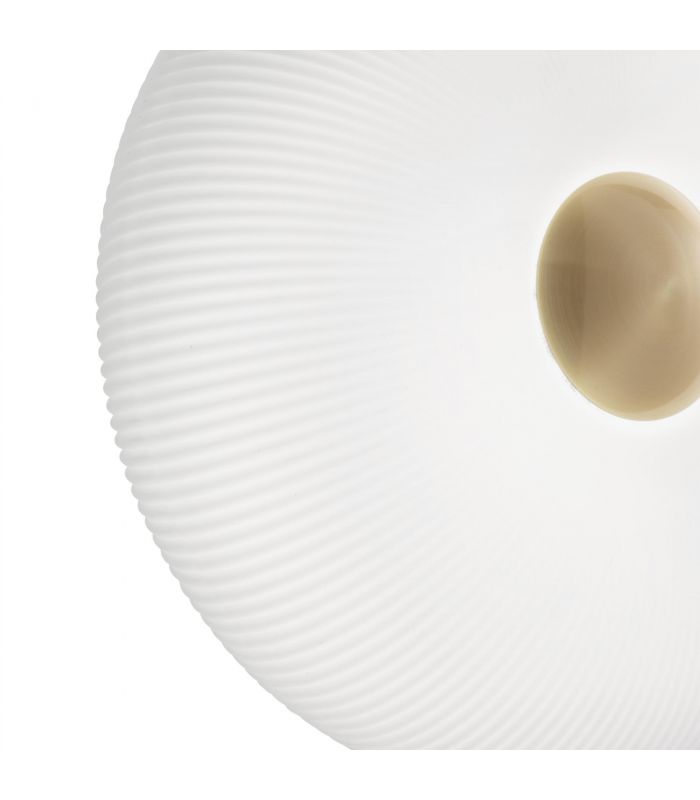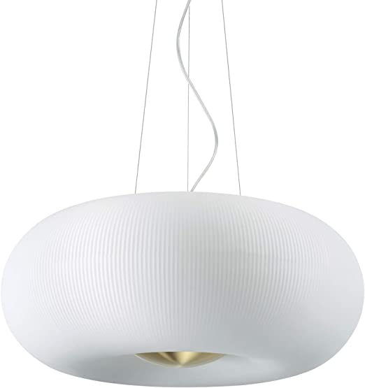 Kaunis ja moderni Arizona riippuvalaisin on elegantti yhdistelmä messinkiviimeisteltyä metallirunkoa ja valkoista happosyövytettyä puhallettua lasia. Lasikuvun kohokuvioidut koristeraidat luovat valaisimeen hienovaraista elävyyttä ja tuovat tilaan pehmeää, miellyttävää valoa.