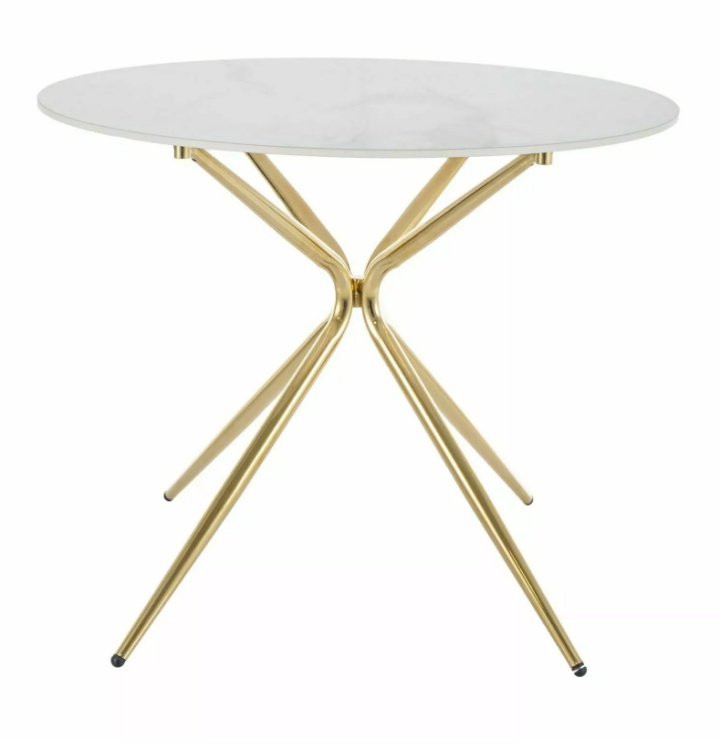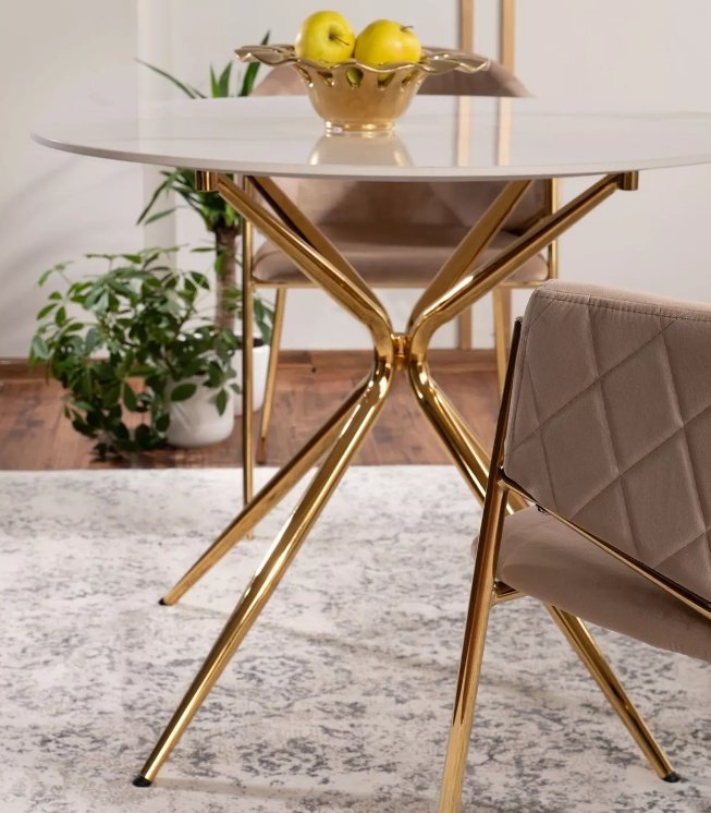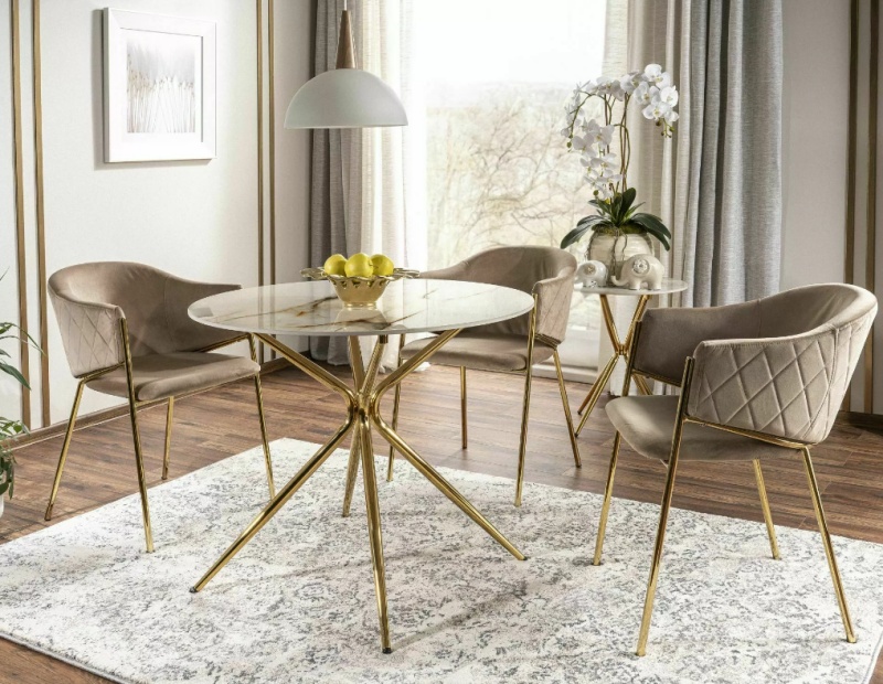Azo Ceramic -pyöreä ruokaryhmä yhdistää kultaisen metallirungon ja valkoisen marmorikuvioidun kannen, tuoden ruokailutilaan eleganttia ja modernia ilmettä. Kompakti pyöreä muoto sopii täydellisesti pienempiin tiloihin, tarjoten neljälle hengelle tyylikkään ja toimivan ratkaisun.