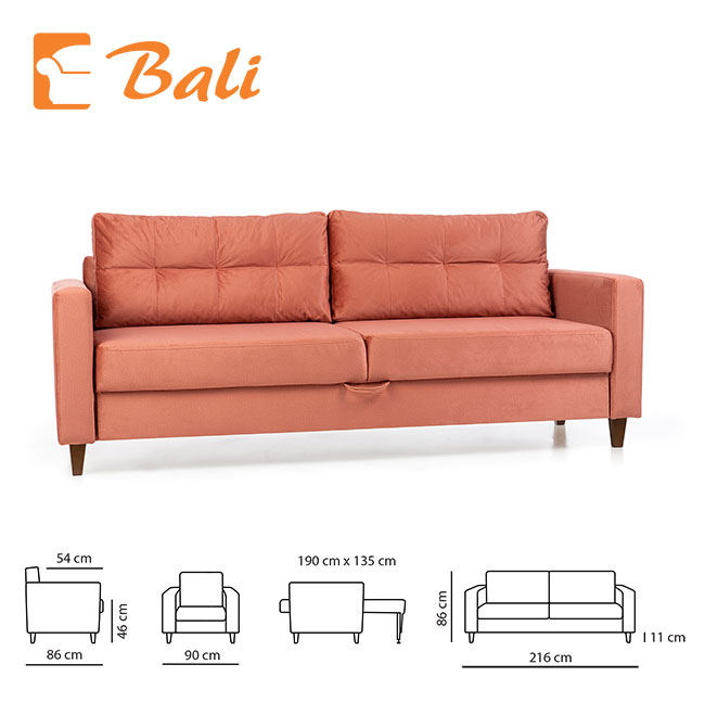Käytännöllinen Bali vuodesohva tarjoaa sekä istuin- että nukkumismukavuutta tyylikkäässä paketissa. Lisäksi Bali vuodesohvassa on pieni vuodevaatelaatikko. Vuode avautuu näppärästi vetämällä istuinosaa eteenpäin, jolloin vuodevaatelaatikko avautuu ja sen jälkeen kääntämällä selkänojan makuuasentoon. Istuimissa laadukas zig-zag jousitus ja laadukkaat vaahtomuovipehmusteet tarjoavat napakan istuintuntuman.