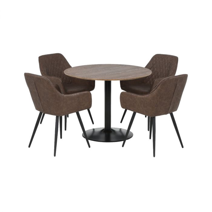 Bari-ruokapöytä tuo tilaan modernia ryhtiä mustaksi maalatun metallijalan ja tammiviilutetun MDF-kannen ansiosta. Pyöreä muoto tekee pöydästä helposti lähestyttävän ja antaa sille kevyen, selkeälinjaisen ilmeen, joka sopii täydellisesti niin moderniin kuin klassiseenkin sisustukseen. Saatavilla olevat kansivärit – musta ja ruskea – tarjoavat kaksi erilaista tyylivaihtoehtoa.