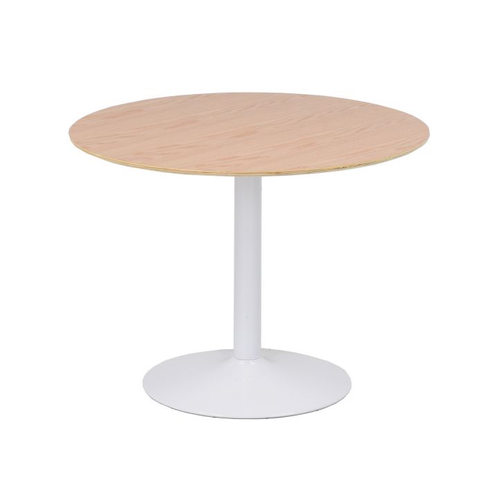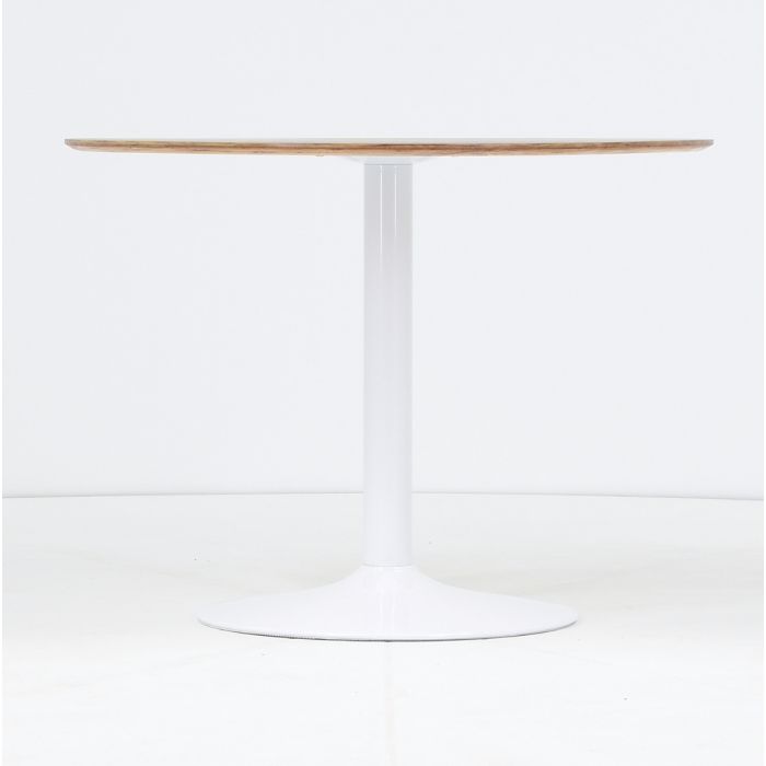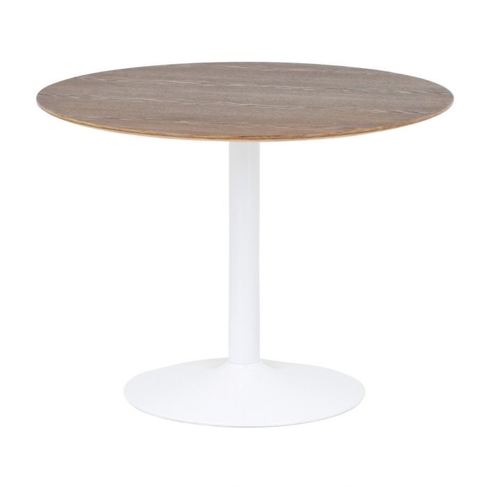 Pyöreä 100 cm halkaisijan pöytä mahdollistaa sujuvan liikkumisen ja toimii täydellisesti myös pienissä tiloissa. Sen ympärille mahtuu mukavasti neljä tuolia, mikä tekee pöydästä ihanteellisen arjen aterioihin, illanistujaisiin ja kompakteihin keittiöihin. Tukeva valkoinen metallijalka varmistaa kestävyyden ja vakaan käyttökokemuksen.