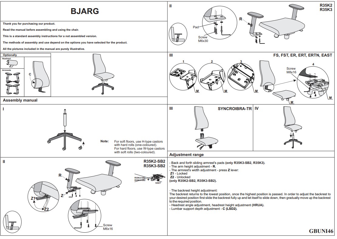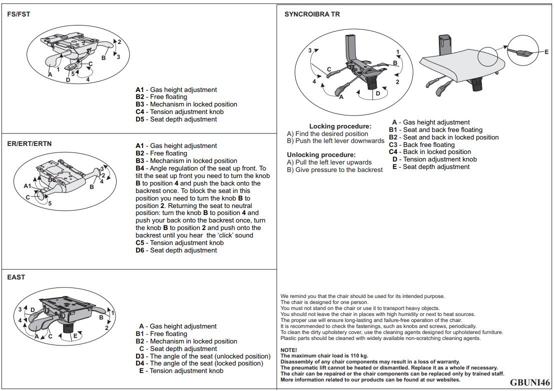 Tuolissa on säädettävä selkänojan kallistus, synkronoitu istuin–selkänoja-mekanismi, istuinsyvyyden ja -korkeuden säätö sekä Anti-Shock -ominaisuus selän suojaamiseksi. Vahva kaasujousi ja muovi- tai alumiiniristikko takaavat tukevuuden, ja pyörät ovat suunniteltu koville lattioille.