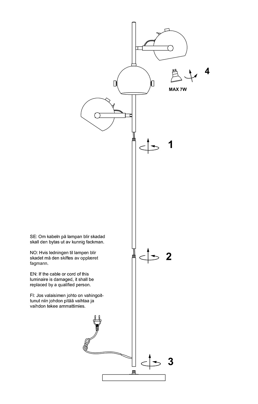 Kestävä metallirunko, tekonahkaiset yksityiskohdat ja metallikuvut takaavat viimeistellyn ja pitkäikäisen lopputuloksen. 152 cm korkea rakenne ja GU10-kantaiset valonlähteet (3 x 7 W) tarjoavat tehokasta valaistusta säilyttäen valaisimen sirot ja modernit mittasuhteet.