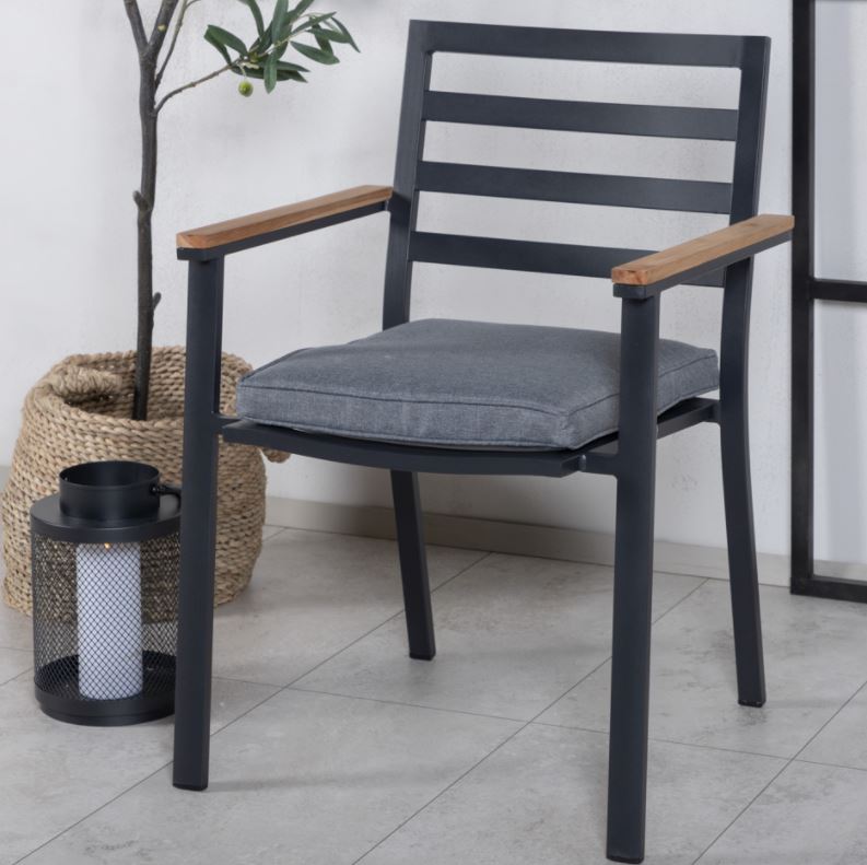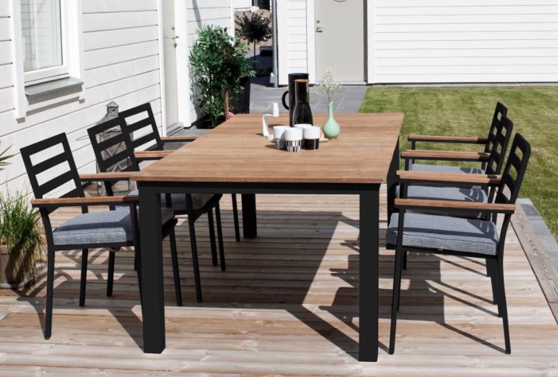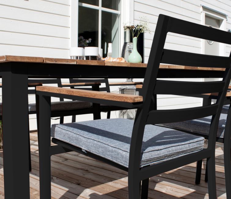 Käsinojissa upeat puiset yksityiskohdat. Yhdistä ulkotilasi ruokapöytään ja luo samalla viehätystä terassisi sisustukseen. Alumiinista ja ruostumattomasta teräksestä valmistetut ulkokalusteet tulee puhdistaa säännöllisesti vedellä ja miedolla saippualla.