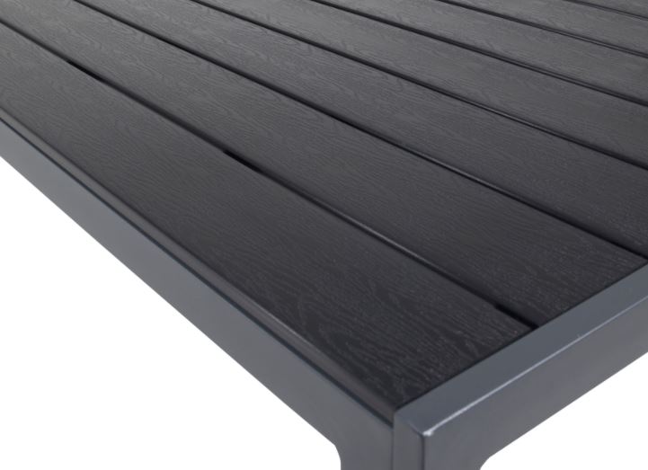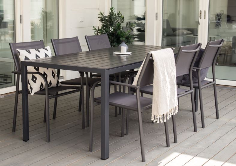 Pöydän kansi on polywoodia ja pöydän jalat alumiinia. Materiaalit ovat sekä kestäviä että kevyitä, joten tarvittaessa ruokapöydän siirtäminen on vaivatonta. Alumiinista ja ruostumattomasta teräksestä valmistetut ulkokalusteet tulee puhdistaa säännöllisesti vedellä ja miedolla saippualla.