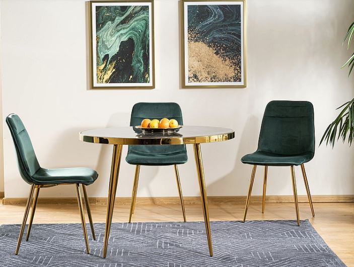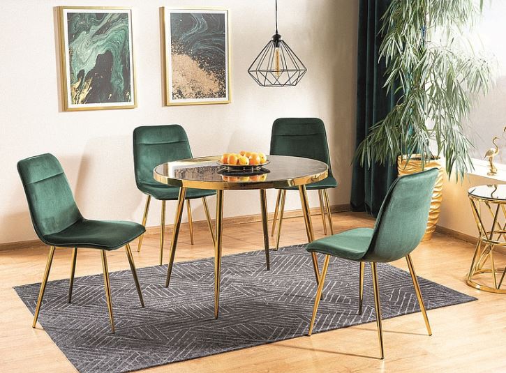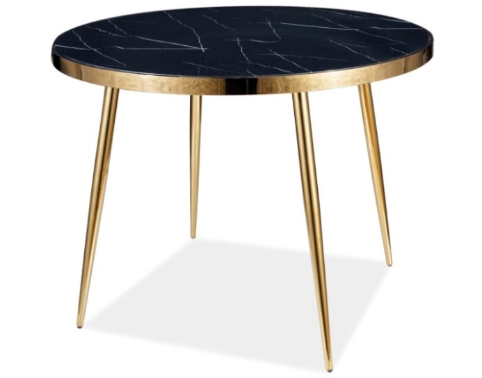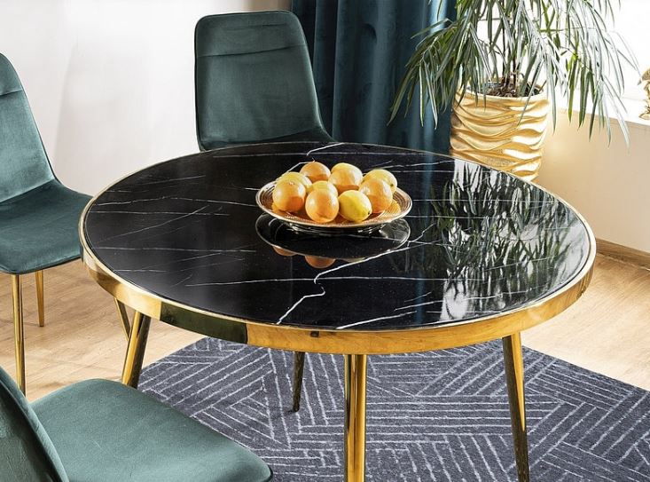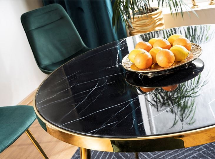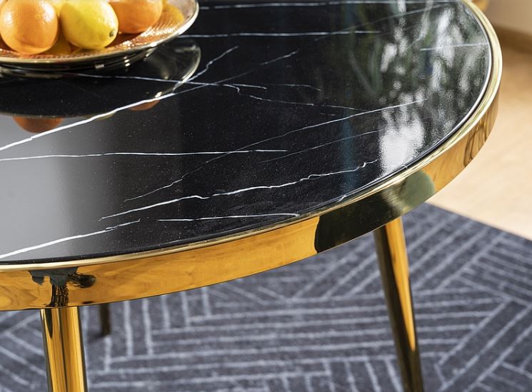 Caceres-ruokapöytä yhdistää kultaisen metallirungon ja mustan marmorikuvioidun lasipinnan, luoden näyttävän ja ylellisen kokonaisuuden, joka sopii täydellisesti moderniin sisustukseen. Sen huolellisesti viimeistellyt yksityiskohdat tekevät pöydästä tilan tyylikkään keskipisteen.