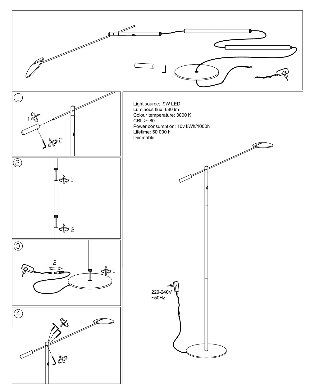 9 watin LED-valonlähde tuottaa 680 lumenin kirkkauden miellyttävällä 3000K lämpimän valkoisella sävyllä. Pitkä 300 cm virtajohto tuo joustavuutta sijoitteluun, ja mukana toimitettavat LED-polttimot takaavat vaivattoman käyttöönoton heti asennuksen jälkeen.