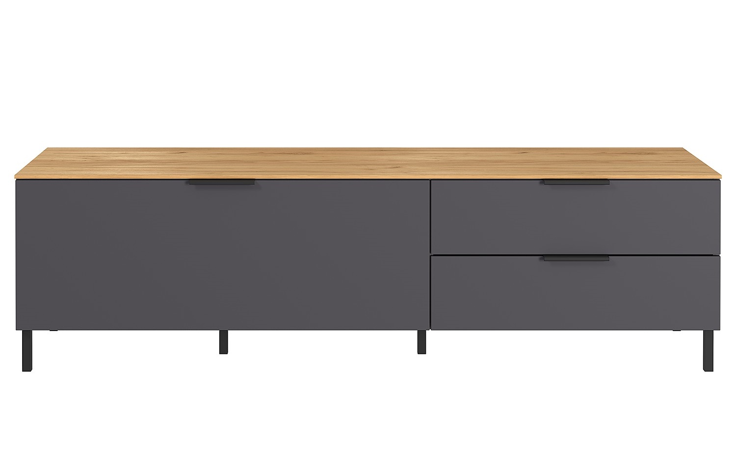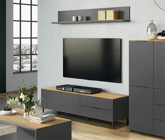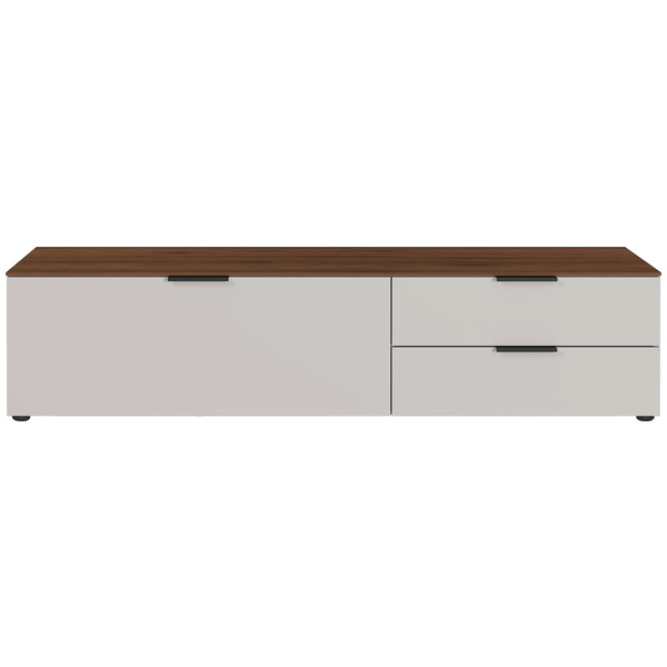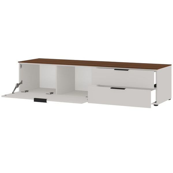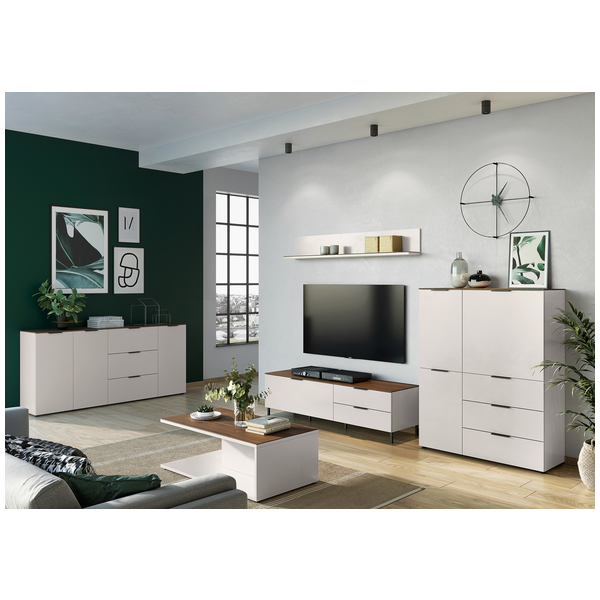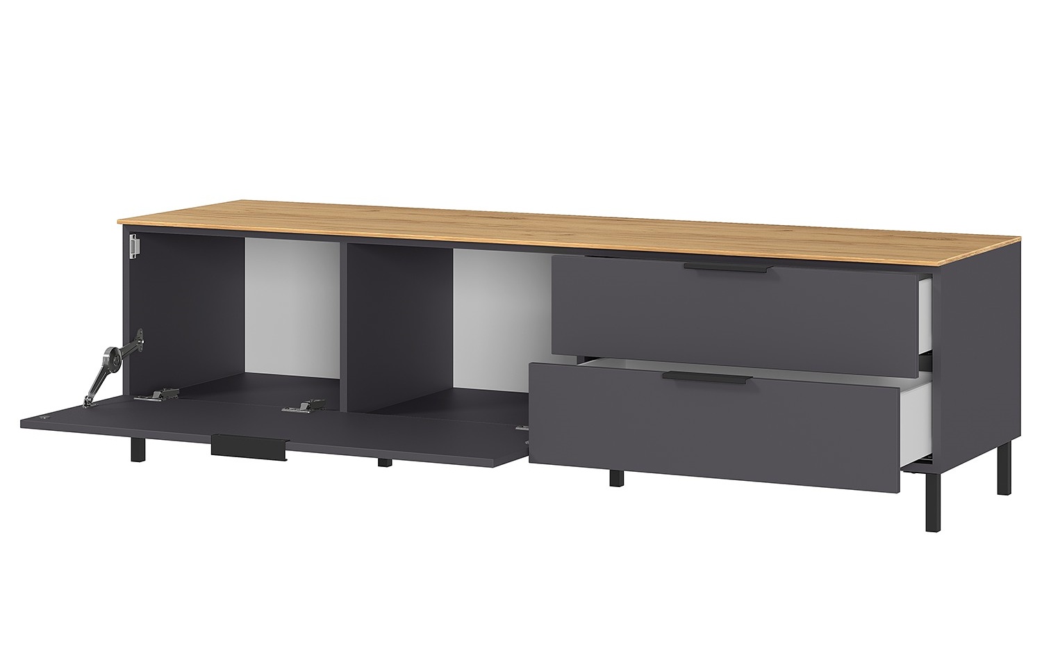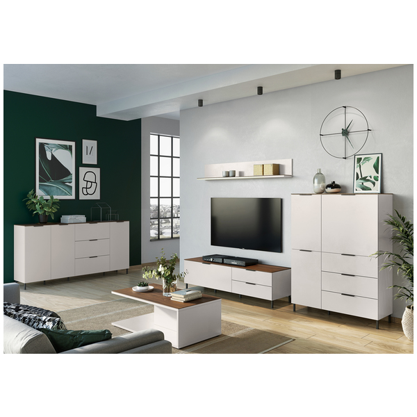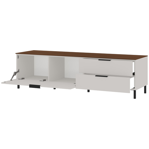 Vasemman puolen kaksi klaffiovellista kaappia ja oikean puolen itsestään sulkeutuvat laatikot tekevät arjesta sujuvaa. Selkeä rakenne ja älykkäästi suunnitellut säilytyspaikat tarjoavat tilaa viihdelaitteille, tarvikkeille ja muille kodin esineille.