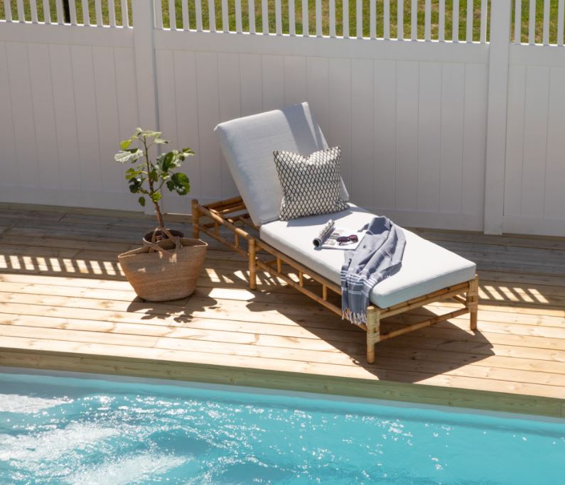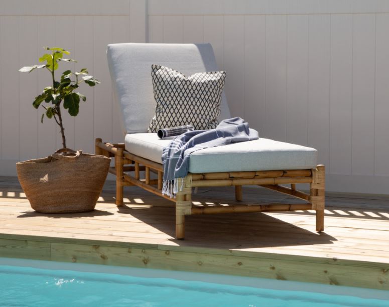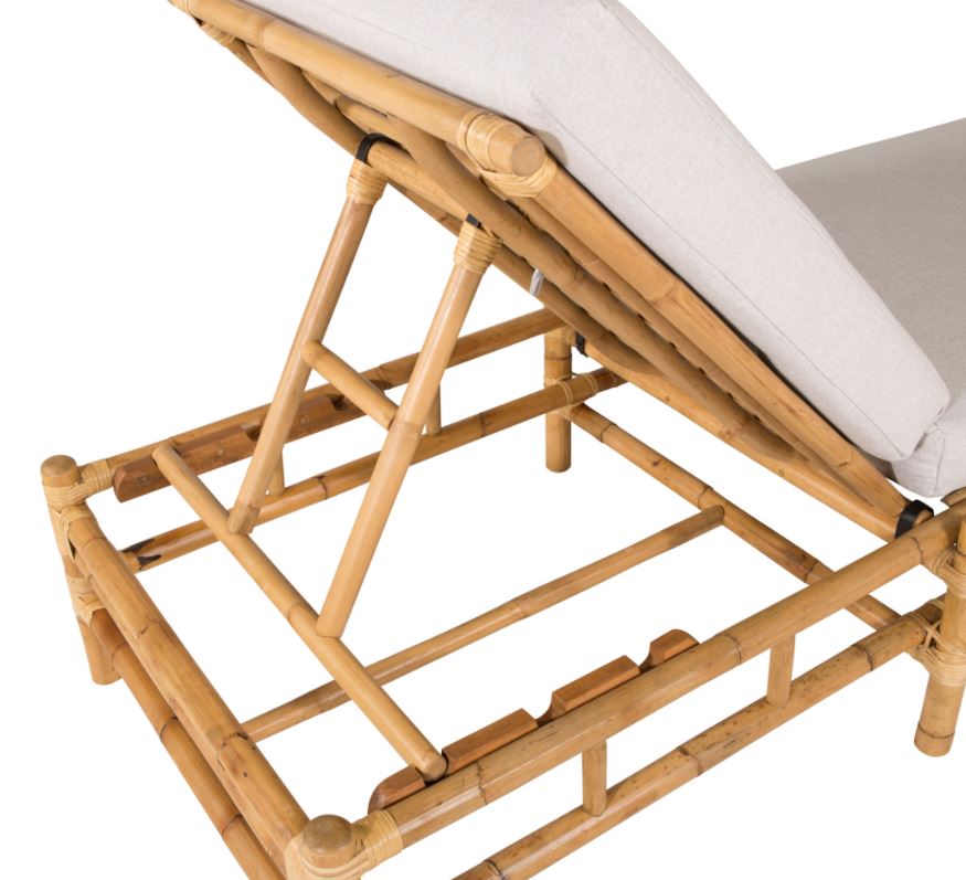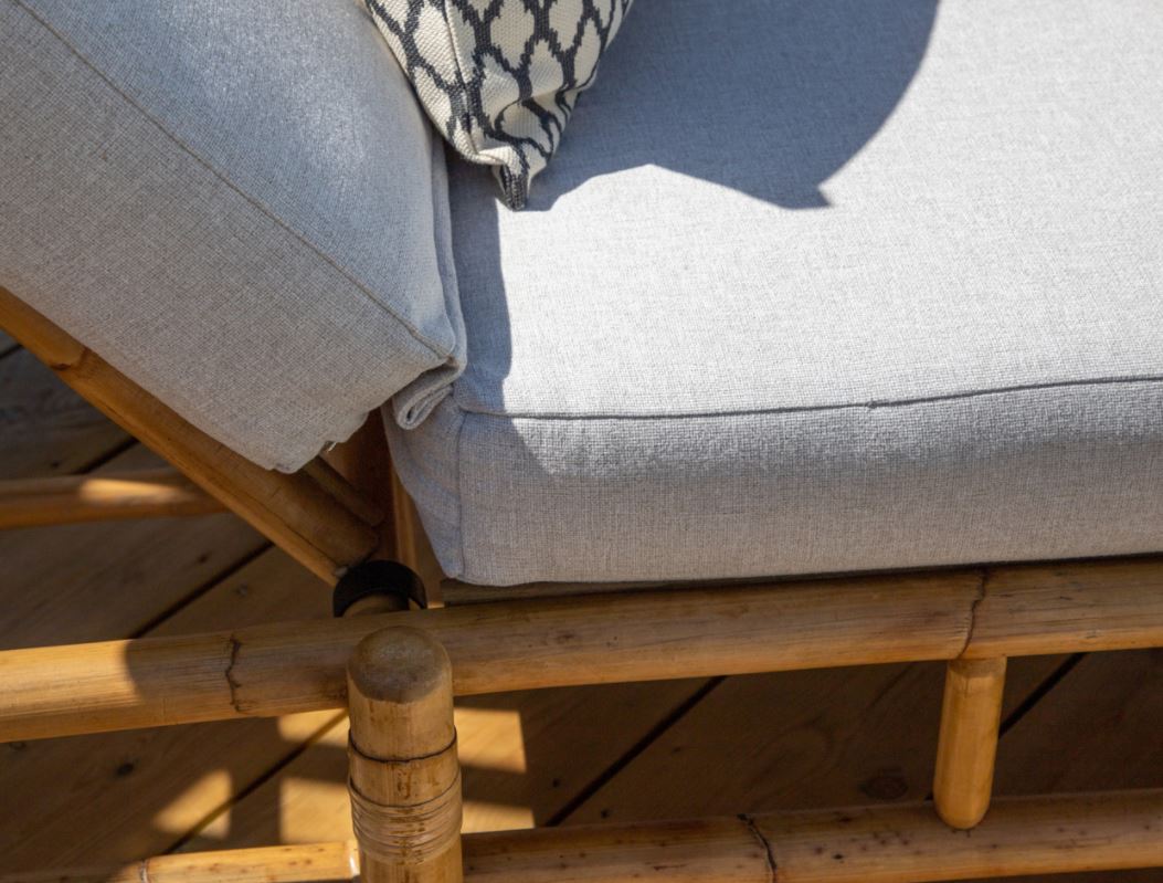 Mukana olevat tyynyt on valmistettu pehmeästä polyesterikankaasta. Runko on valmistettu luonnonvärisestä bambusta jolloin luonnonmateriaali antaa jokaiselle huonekalulle ainutlaatuisen luonteen. Samaan sarjaan saatavana sohvaa, sohvapöytää ja nojatuolia. Bambu on luonnonmateriaali, joka on uskomattoman tyylikäs ja trendikäs, mutta ei kovin säänkestävä. Kalusteita ei mielellään jätetä ulos, vaan ne tulee sijoittaa kuiviin tiloihin. Vältä suuria lämpötilaeroja. Helpoin puhdistus tehdään kostealla liinalla.