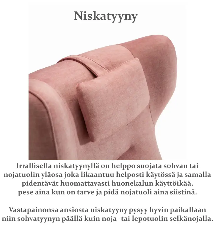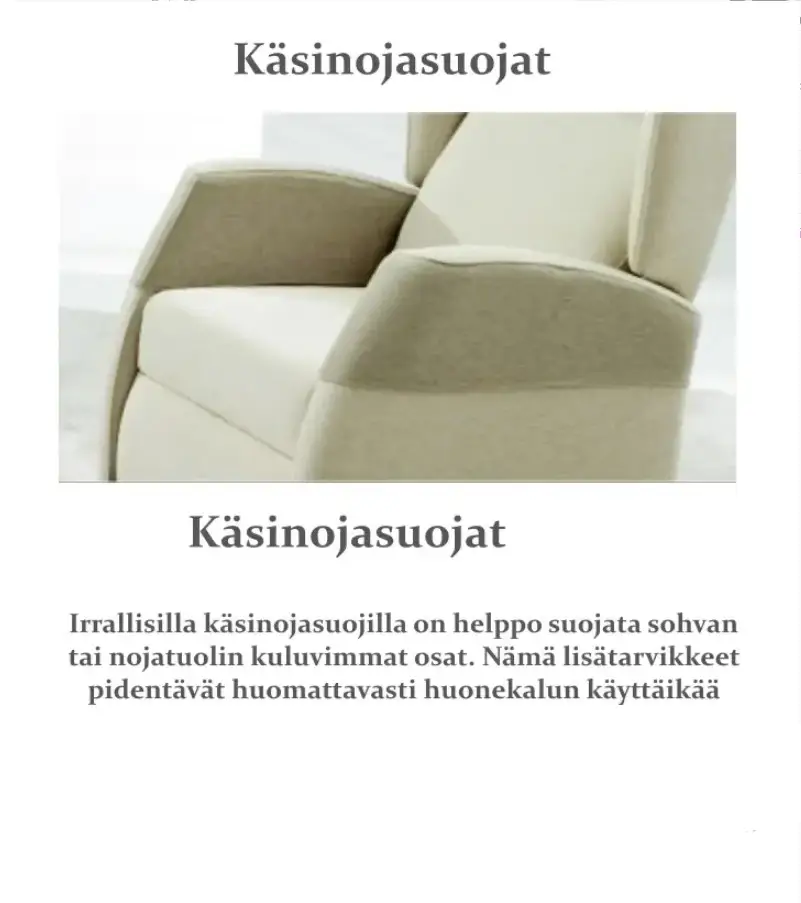 Pehmeä pehmustus, tarkkaan viimeistellyt yksityiskohdat ja laadukkaat kangasvaihtoehdot tekevät Caprista pitkäikäisen ja miellyttävän nojatuolin. Kokonaisuutta voi täydentää käsinojasuojilla tai pestävällä irtoniskatyynyllä, ja tarvittaessa tuoli voidaan tilata myös muilla kankailla asiakaspalvelun kautta.
