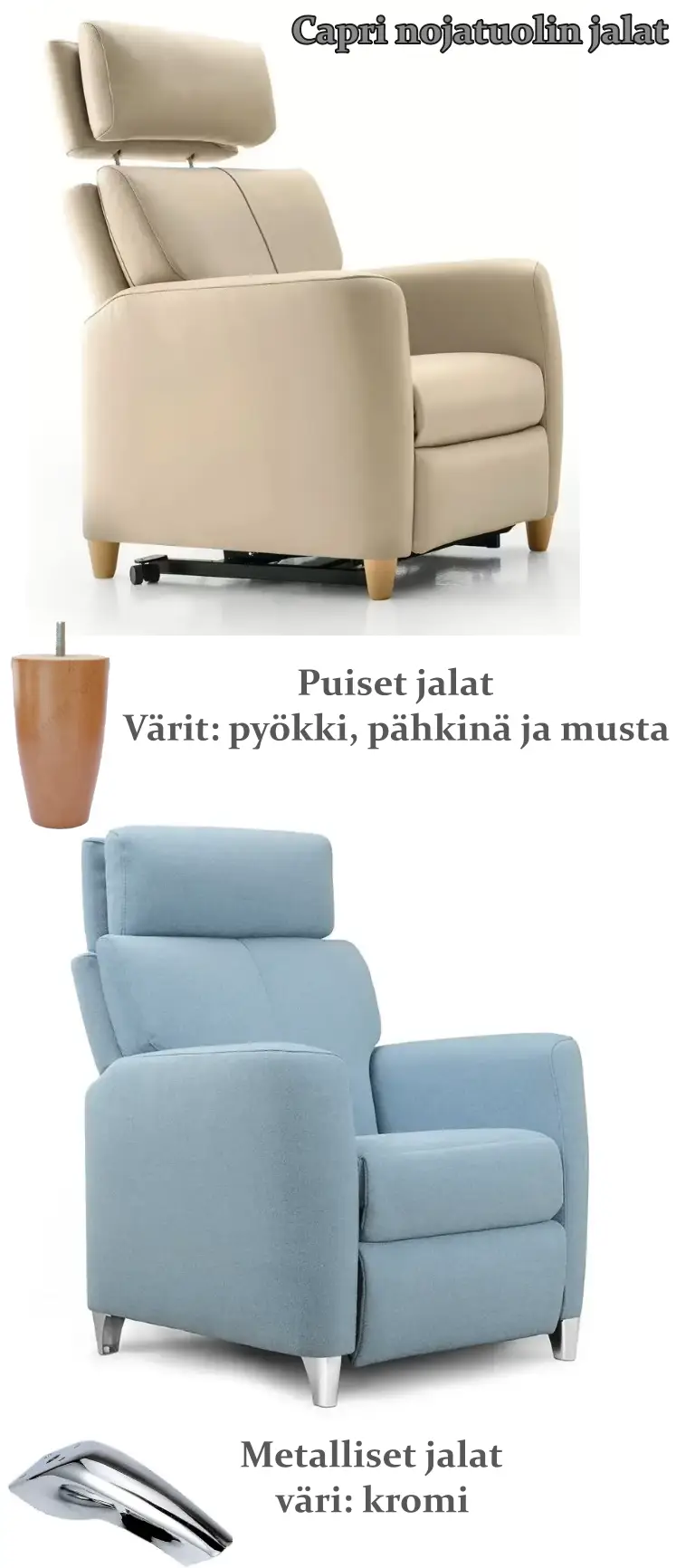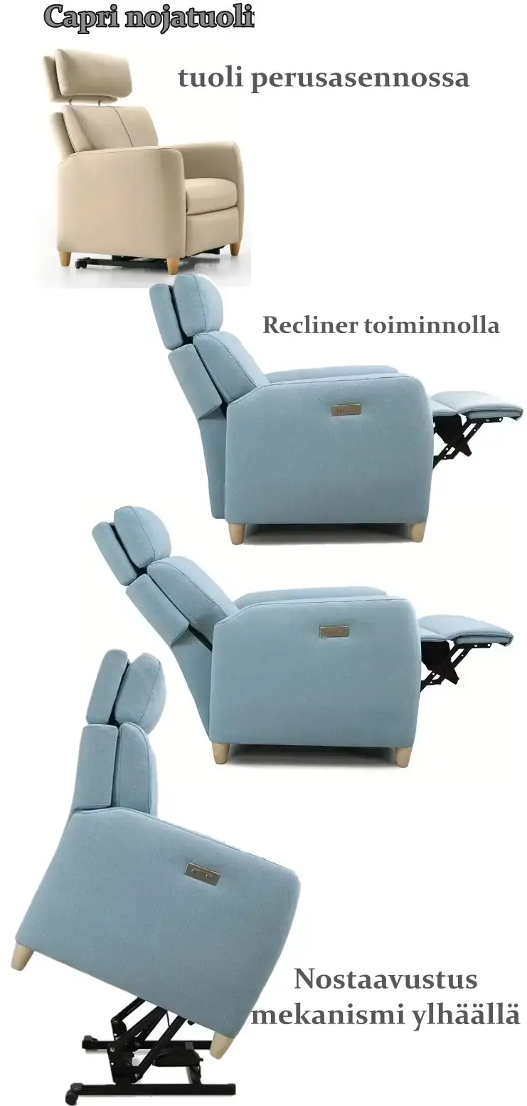 Capri-recliner tarjoaa modernin manuaalisen tai sähkökäyttöisen mekanismin, jonka ansiosta voit säätää niskatuen korkeutta sekä kallistusta juuri omiin tarpeisiisi – sopien täydellisesti sekä lyhyille että pitkille käyttäjille. Nostoavusteinen vaihtoehto helpottaa tuolista ylös nousemista ja tekee tuolista erinomaisen valinnan monenlaisiin käyttötarpeisiin.