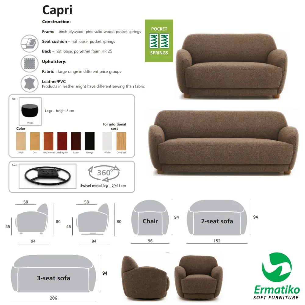 Moderni Capri sohvakalusto yhdistää napakan istuintuntuman, laadukkaat verhoiluvaihtoehdot ja kestävän massiivipuu/vanerirungon, mikä tekee siitä pitkäikäisen ja näyttävän kokonaisuuden moderniin kotiin. Tyylikkäät puujalat, kestävä kangas ja 360° pyörivällä metallijalustalla varustettu nojatuoli tuovat kalustoon sekä käytännöllisyyttä että hakukoneystävällistä laatua.