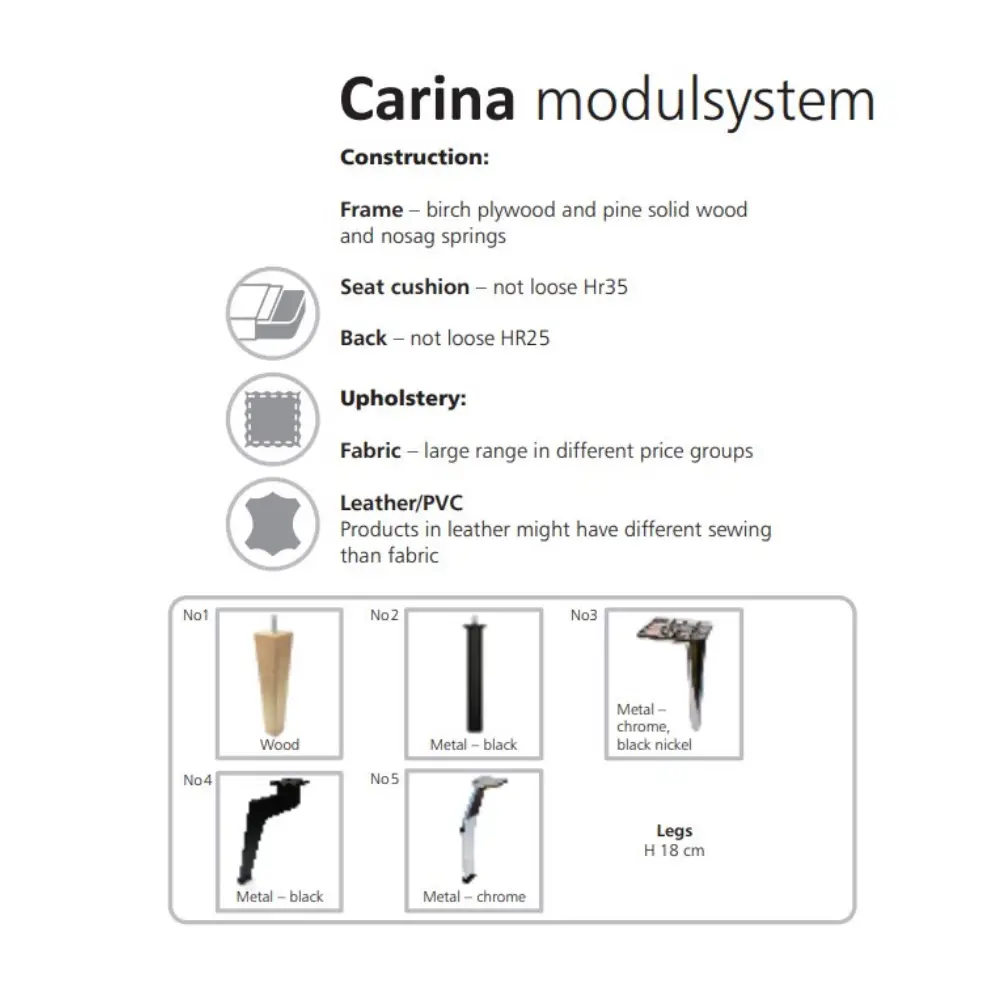 Carina 2C Sohva tarjoaa ryhdikkään istuttavuuden, laadukkaat verhoiluvaihtoehdot sekä modernit puu- tai metallijalat, jotka korostavat sen trendikästä ilmettä. Tukeva massiivipuu/vanerirunko ja mukavat kiinteät tyynyt tekevät siitä kestävän ja hakukoneystävällisesti erottuvan valinnan kotiin.