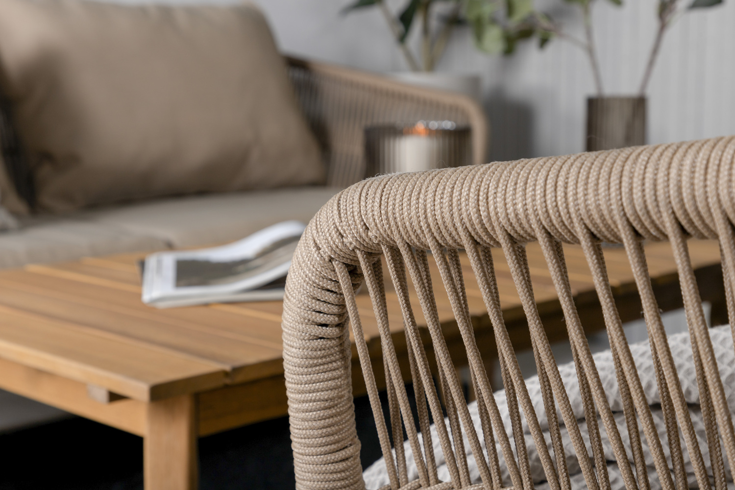 Chania on trendikäs sekä moderni sohvaryhmä, joka keskittyy mukavuuteen. Sohvan ja nojatuolien lisäksi ryhmään kuuluu matala sohvapöytä joka on valmistettu kokonaan akaasiapuusta. Nojatuoli ja sohvat ovat valmistettu alumiinista ja niissä on akaasiajalat. Tuolien selkä ja sivut on punottu beigellä köydellä antaen tyylikkään muotoilun. Akaasiansävyiset jalat yhdessä sohvapöydän kanssa luovat ainutlaatuisen yhtenäisen kokonaisuuden. Pehmeät istuintyynyt sisältyvät tuotteeseen.