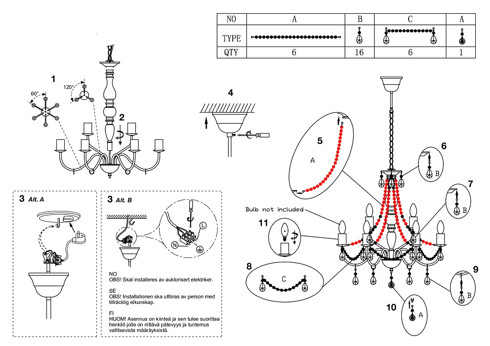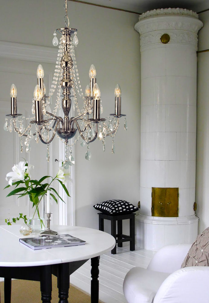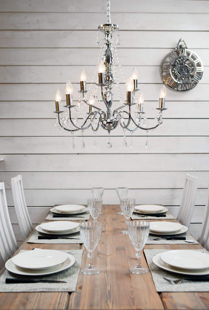 Chateau-kristallikruunu hyödyntää yhdeksää E14-polttimoa, jotka yhdessä luovat runsaan ja tasaisesti jakautuvan valaistuksen. Kirkkaat kristallit taittavat valoa kauniisti, lisäten tilaan syvyyttä ja näyttävää kimallusta niin arkeen kuin juhlavampiinkin hetkiin.
