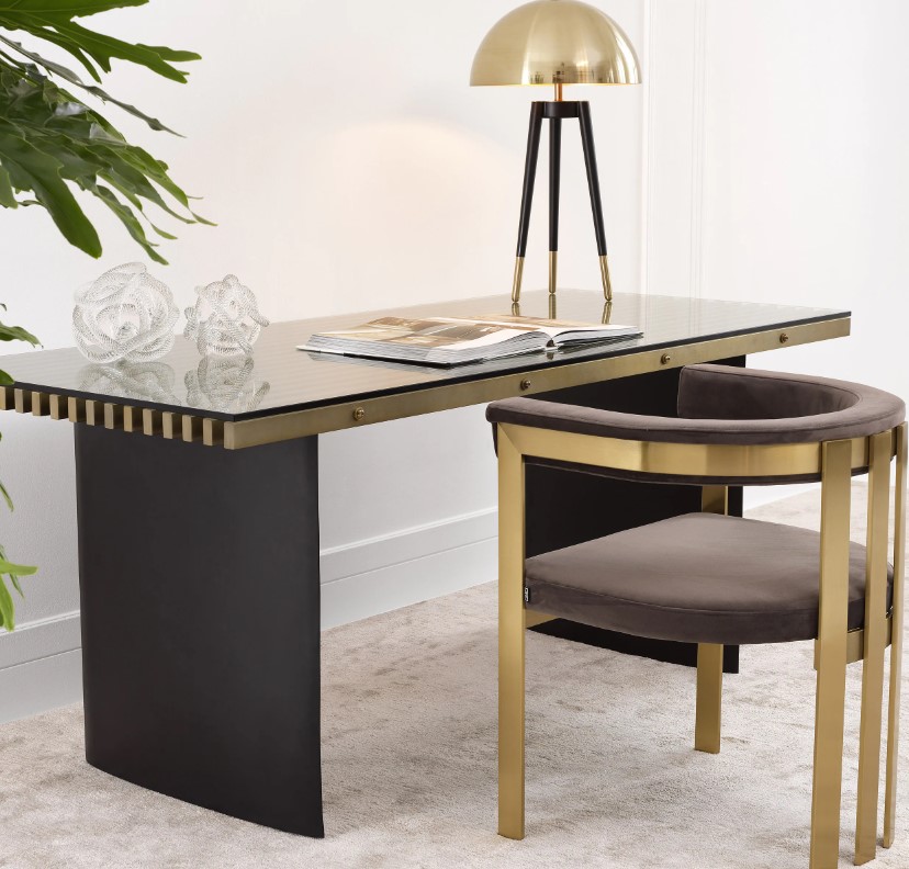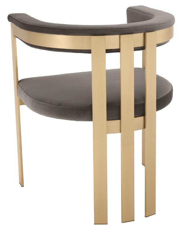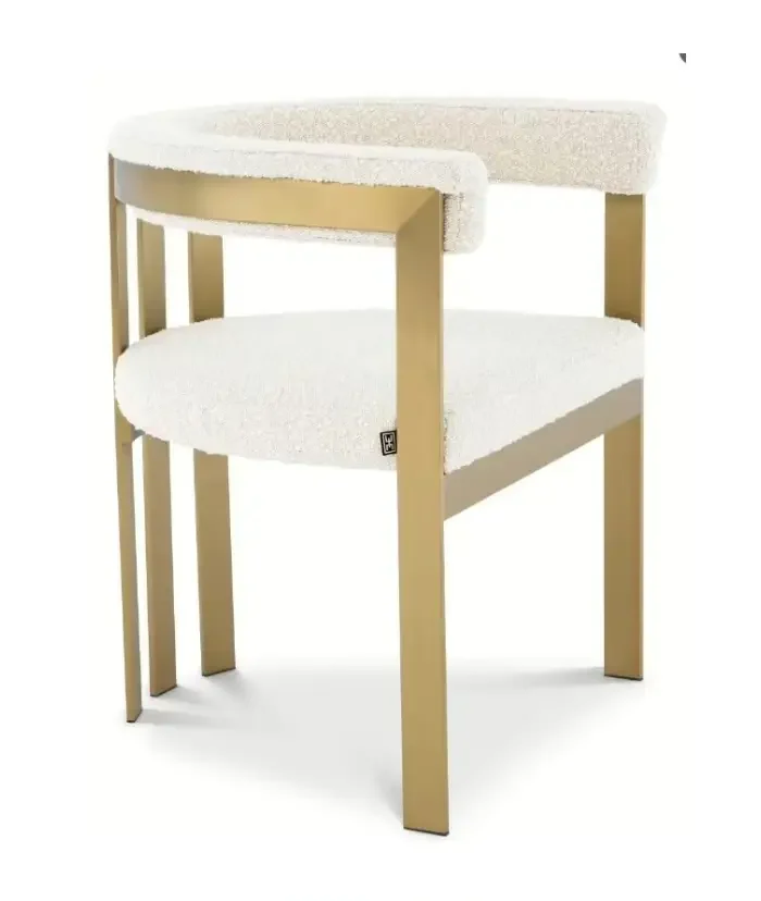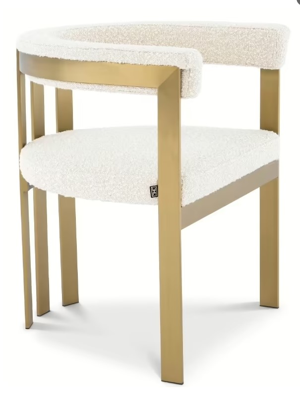 Voit valita kahdesta upeasta verhoiluvaihtoehdosta: kermanvärisestä bouclésta tai harmaasta sametista, jotka molemmat korostavat kauniisti harjatun messingin tai kiillotetun teräksen jalkojen ylellistä viimeistelyä. Vaneri, polyesterivaahto ja 100 % polyesteriverhoilu takaavat tuolin kestävyyden ja pitkäikäisen käytön.