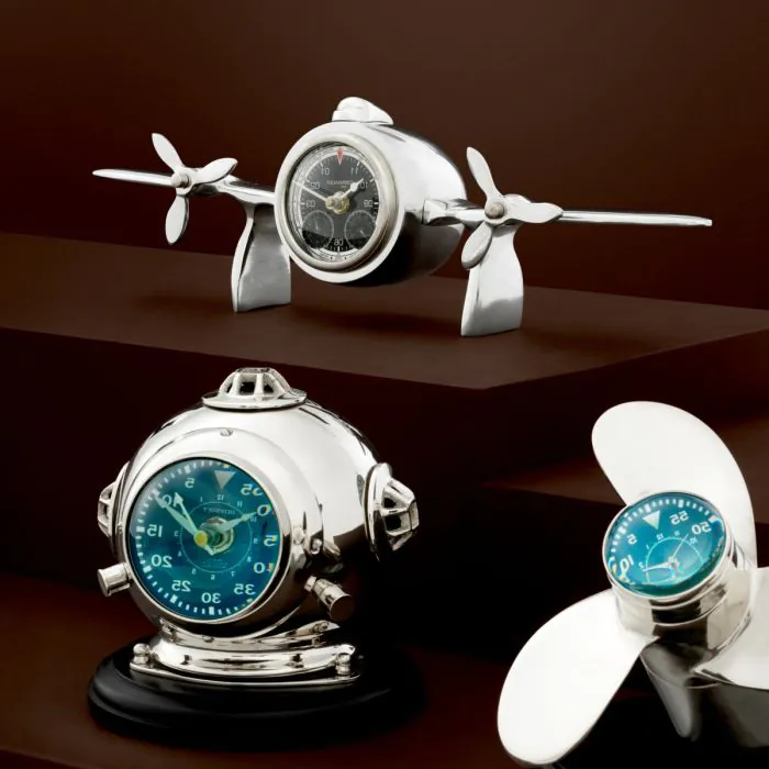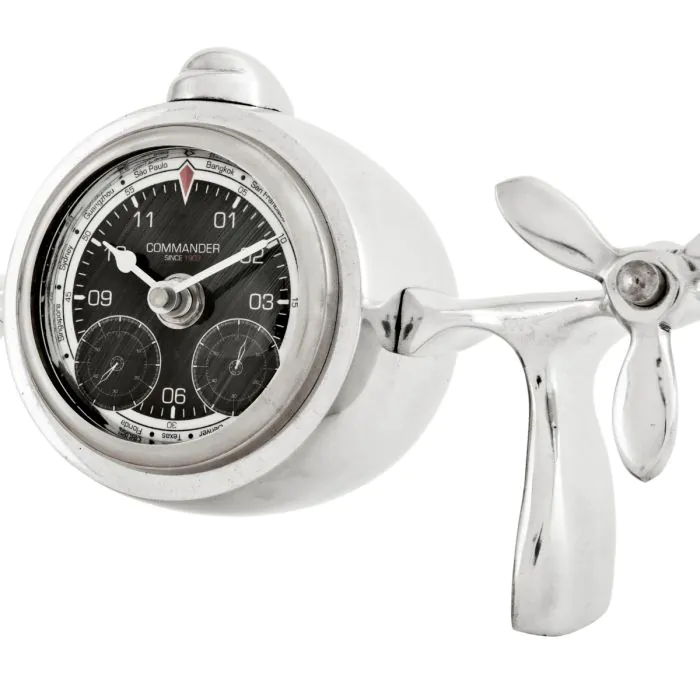 Commander Clock tuo kotiisi klassisten potkurisuihkukoneiden ikonisen estetiikan, tehden siitä täydellisen lisän ilmailuteemaisen sisustuksen ystäville. Korkeusmittaria muistuttava kellotaulu ja kiillotettu nikkelirunko luovat aidon, elegantin ja erottuvan kokonaisuuden.