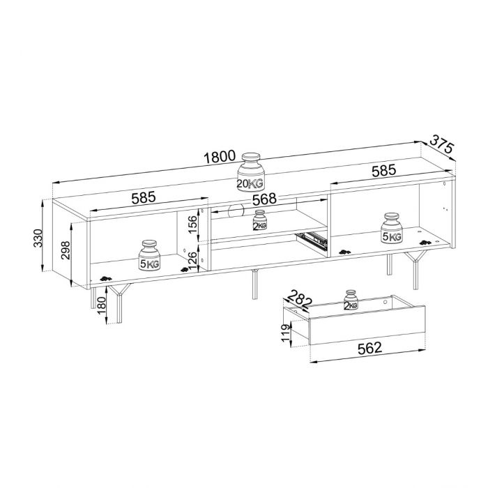 Leveydeltään 180 cm, syvyydeltään 38 cm ja korkeudeltaan 51 cm oleva tv-taso tarjoaa reilusti tilaa suurille televisioille ja elektroniikalle. Kokonaiskantavuus 30 kg ja toimitus osina varmistavat, että tv-taso on sekä tukeva että helppo sijoittaa omaan kotiin.