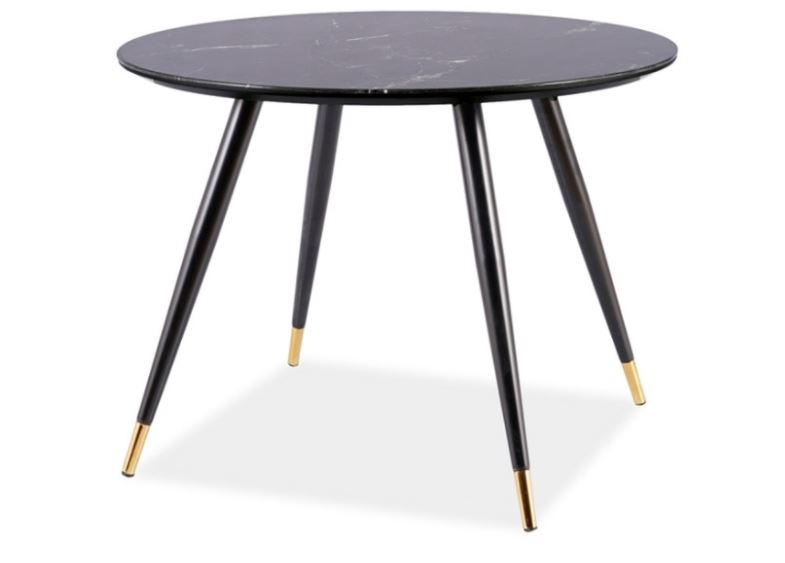 Mustat metallijalat ja kullanväriset holkit tuovat pöytään sekä tukevuutta että ylellistä viimeistelyä, varmistaen pitkäikäisen käytön arjessa.