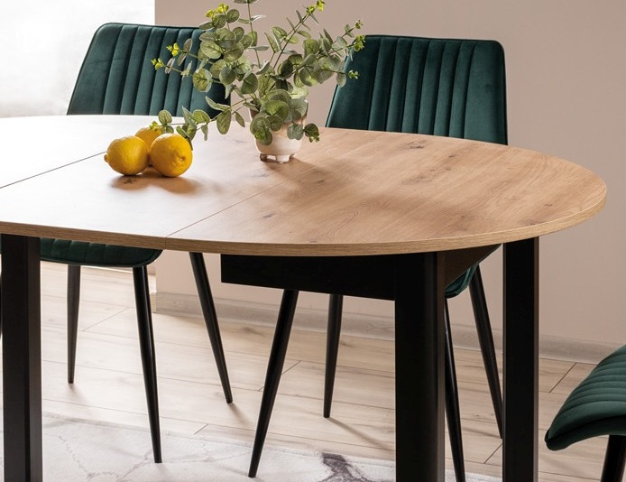 Dante pyöreä ruokapöytä on erinomainen valinta pienempiin tiloihin, ja sen jatkettava ominaisuus tuo joustavuutta arkeen sekä tarjoaa lisätilaa silloin kun sitä tarvitaan.