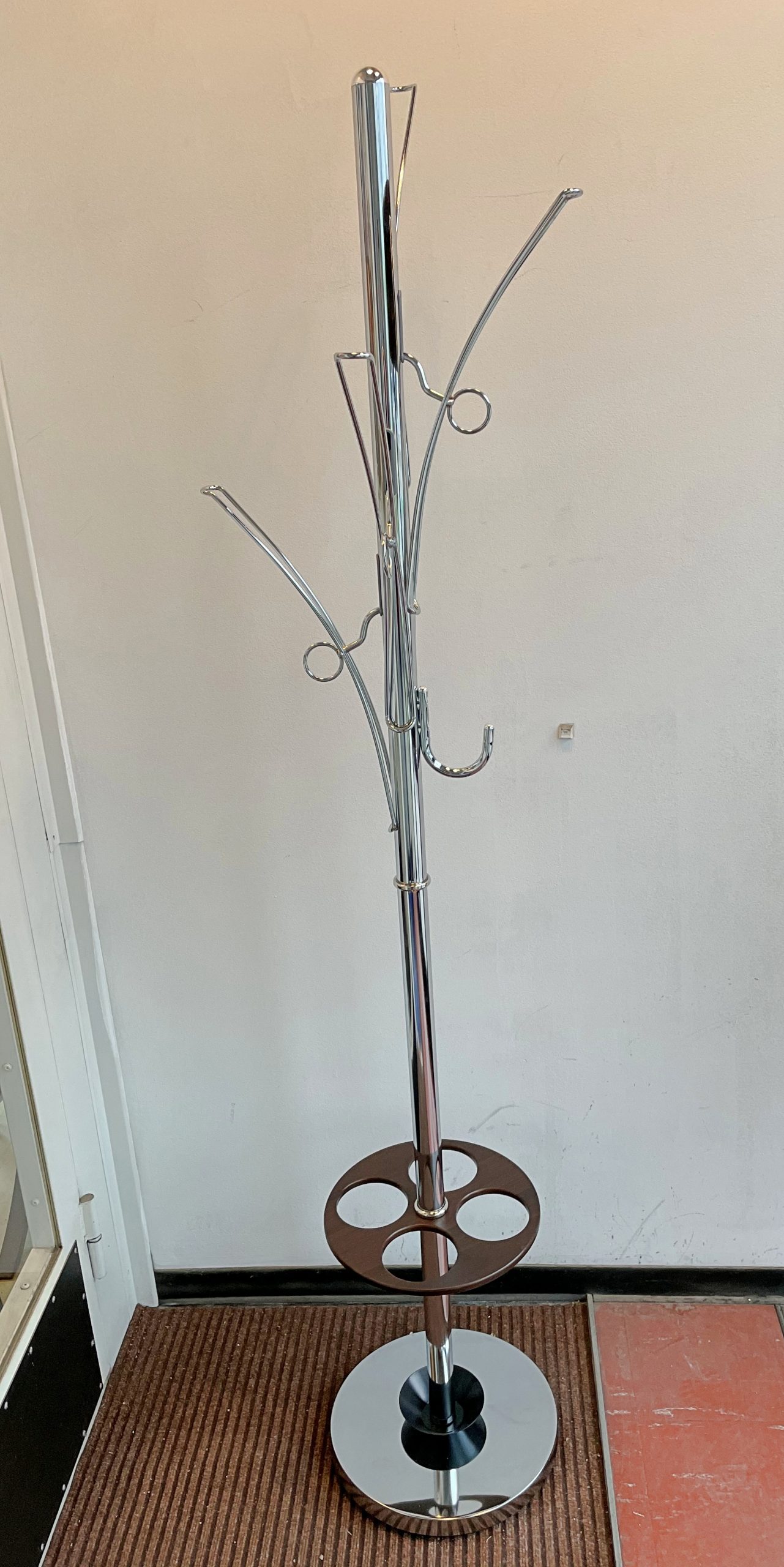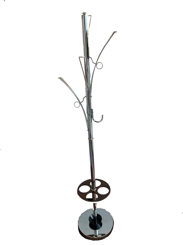 Tukeva, metallivartinen pystynaulakko jossa irrotettavia henkareita (4kpl) – kiinnitettynä toimii koukkuna ja irrotettavana voidaan sijoittaa henkarina naulakkoon. Naulakon alareunassa sateenvarjoteline. Toimitus osina.