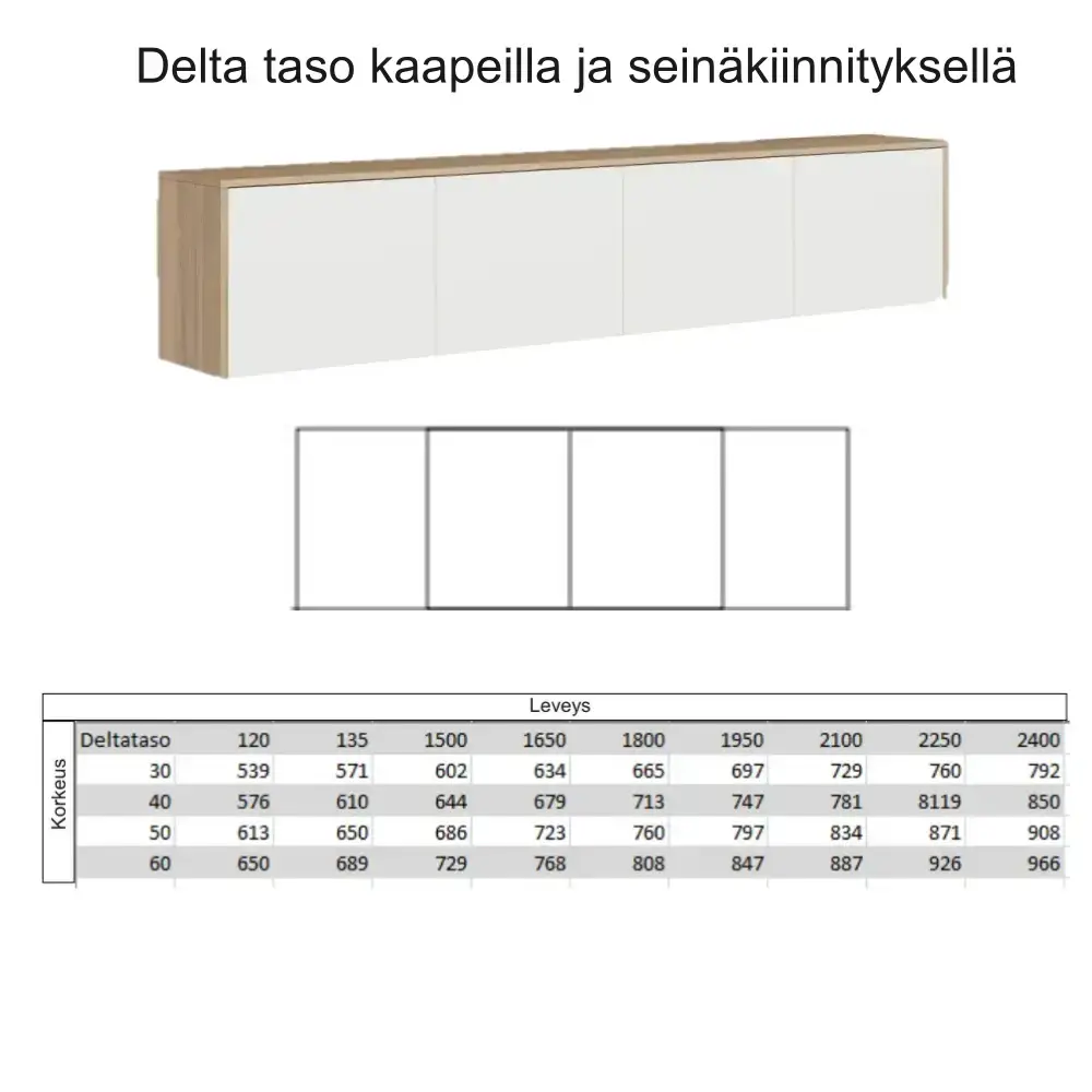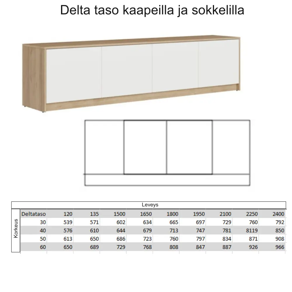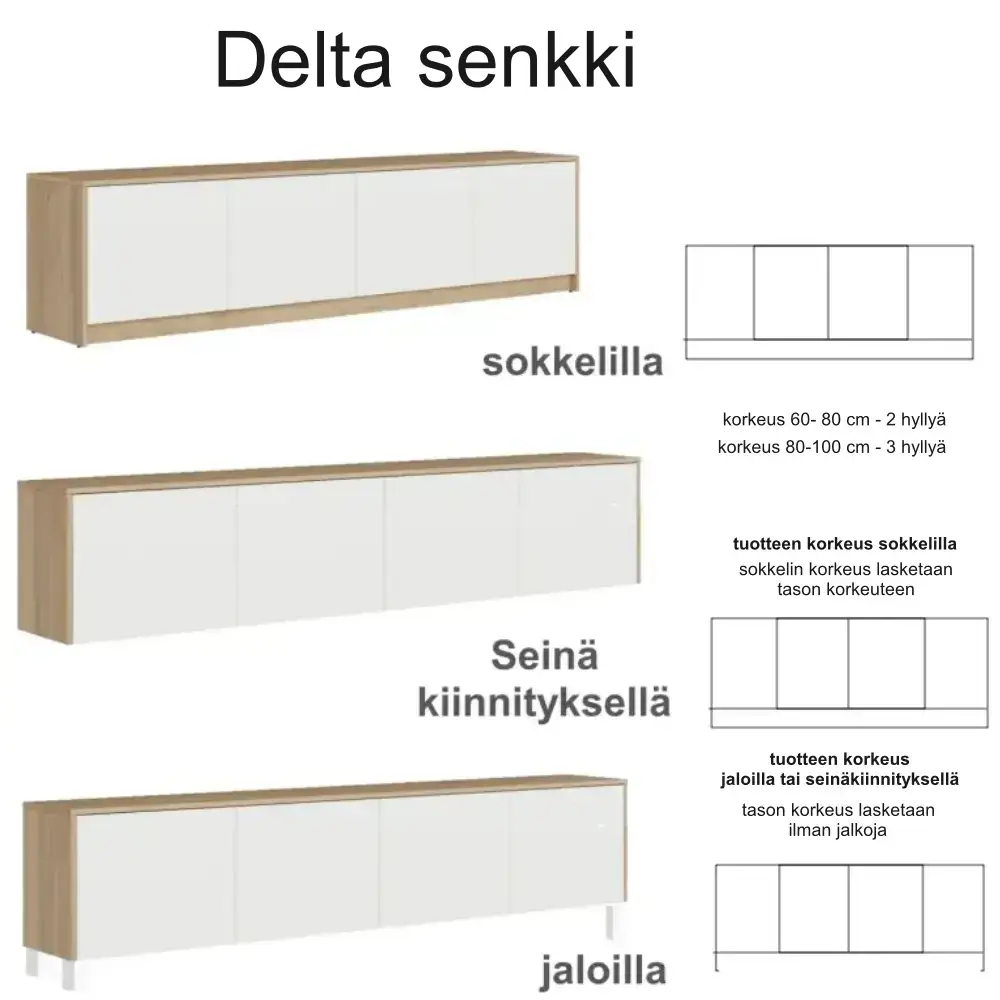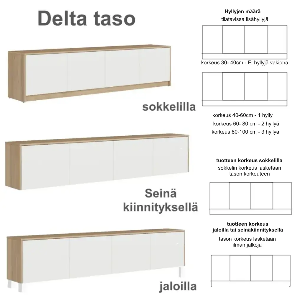 Delta taso tarjoaa täysin mittoihin räätälöitävän ja laadukkaista kotimaisista materiaaleista valmistetun säilytysratkaisun, joka mukautuu eri tiloihin ja käyttötarpeisiin. Valmiiksi koottuna toimitettava senkki tekee hankinnasta helppoa ja tarjoaa hakukoneystävällisen, modernin vaihtoehdon kotiin.